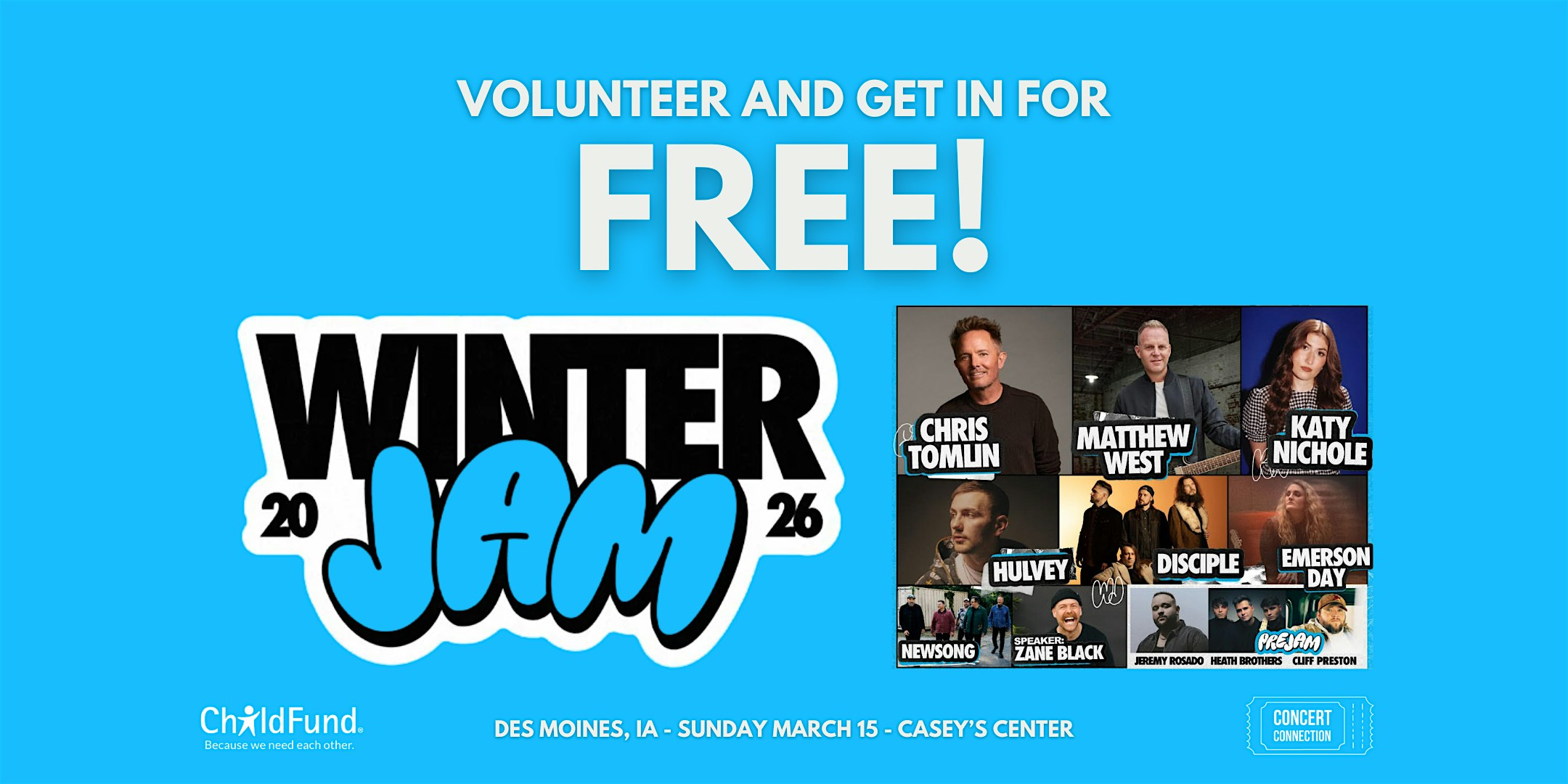 by admin05Mar Des Moines, IA – WinterJam Volunteers – ChildFund Intl at Casey’s Center – Des Moines, IA Des Moines, IA – WinterJam Volunteers – ChildFund Intl at Casey’s Center – Des Moines, IA 1 1 people viewed this event. The WinterJam ’26 tour is coming to Des Moines, IA! Click ‘Get Tickets’ or ‘Reserve a Spot’ to volunteer. Limited spots available! Tickets-RSVP Link Date And Time Sunday, March 15th, 2026 02:00 PM (PST) Venue Casey's Center Location 233 Center Street, Des Moines, IA 50309 Event Types Concert or Performance Event Category Des MoinesIowa Share With Friends Facebook Twitter Linkedin Xing Pinterest Share This Post: