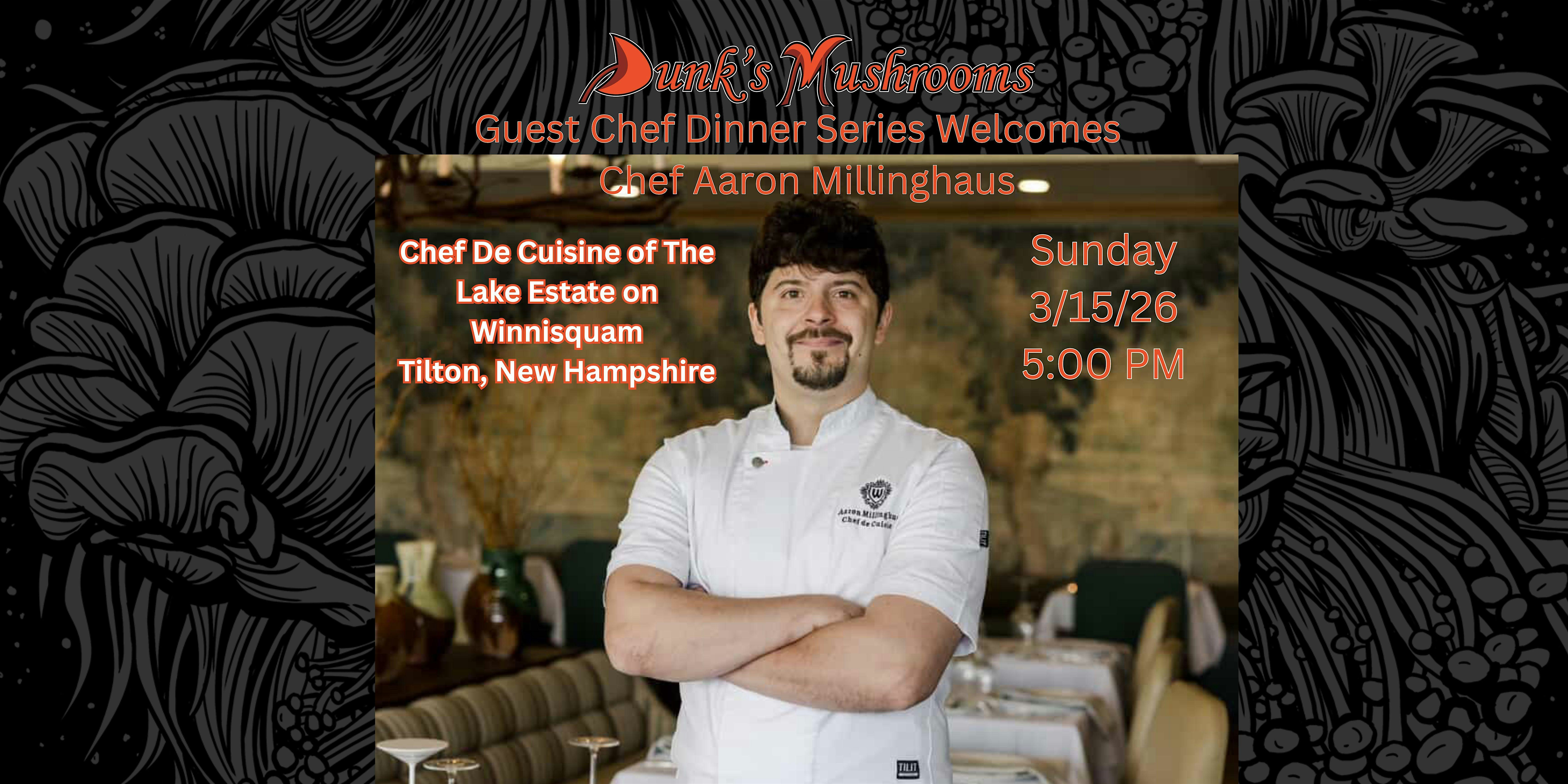 by admin27Feb Dunk’s Mushrooms welcomes Chef Aaron Millinghaus at Dunk’s Mushrooms – Brentwood, NH Dunk’s Mushrooms welcomes Chef Aaron Millinghaus at Dunk’s Mushrooms – Brentwood, NH 1 1 people viewed this event. Meet Chef Aaron Millinghaus Tickets-RSVP Link Date And Time Sunday, March 15th, 2026 05:00 PM (PST) Venue Dunk's Mushrooms Location 313 New Hampshire 125, Brentwood, NH 3833 Event Types Food & Drink Event Category New Hampshire Share With Friends Facebook Twitter Linkedin Xing Pinterest Share This Post: