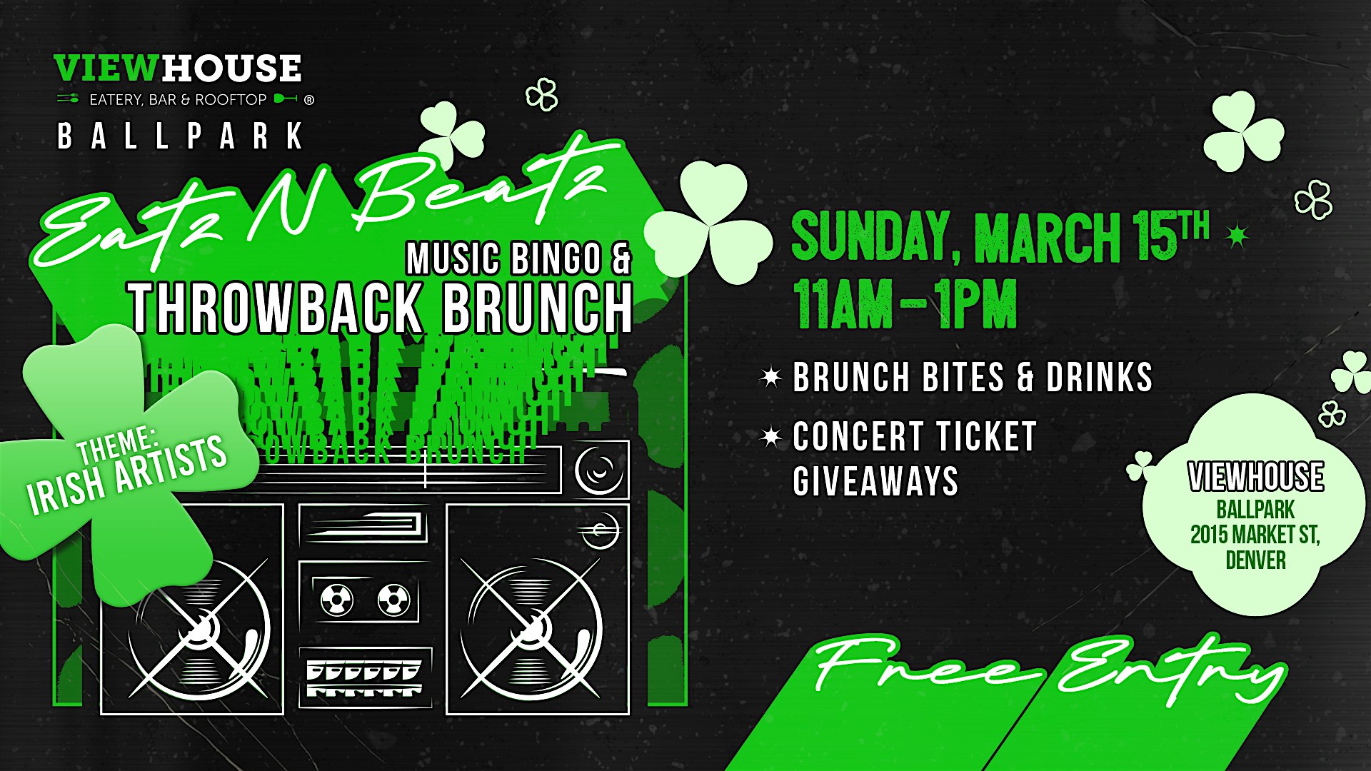 by admin05Mar Eatz N Beats: Music Bingo Brunch at Viewhouse Ballpark – Denver, CO Eatz N Beats: Music Bingo Brunch at Viewhouse Ballpark – Denver, CO 1 1 people viewed this event. Music Bingo Brunch on Sunday, March 15 • 11AM–1PM. Irish artist theme, brunch bites & concert ticket giveaways. Free entry! Tickets-RSVP Link Date And Time Sunday, March 15th, 2026 11:00 AM (PST) Venue Viewhouse Ballpark Location 2015 Market Street, Denver, CO 80205 Event Types MusicParty or Social Gathering Event Category ColoradoDenver Share With Friends Facebook Twitter Linkedin Xing Pinterest Share This Post: