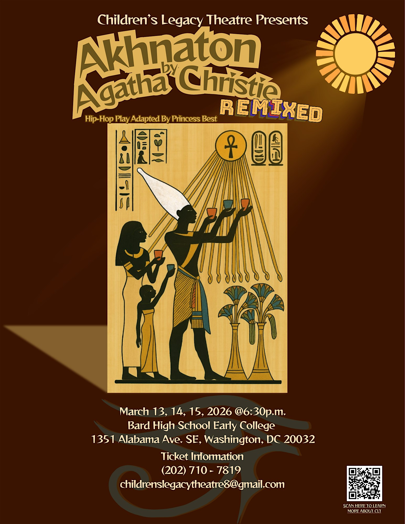 Hip-Hop Theatre Adaptation of Akhnaton at Bard High School Early College DC – Washington, DC Hip-Hop Theatre Adaptation of Akhnaton at Bard High School Early College DC – Washington, DC 1 1 people viewed this event. The Children’s Legacy Theatre’s newest production, Akhnaton, is starring the children of Wards 7 and 8 at Bard Highschool Early College Tickets-RSVP Link Register for event Date And Time Sunday, March 15th, 2026 @ 06:00 PM Location 1351 Alabama Avenue Southeast, Washington, DC 20032 Event Types Concert or PerformancePerforming & Visual Arts Event Category Washington DC Share With Friends Facebook Twitter Linkedin Xing Pinterest