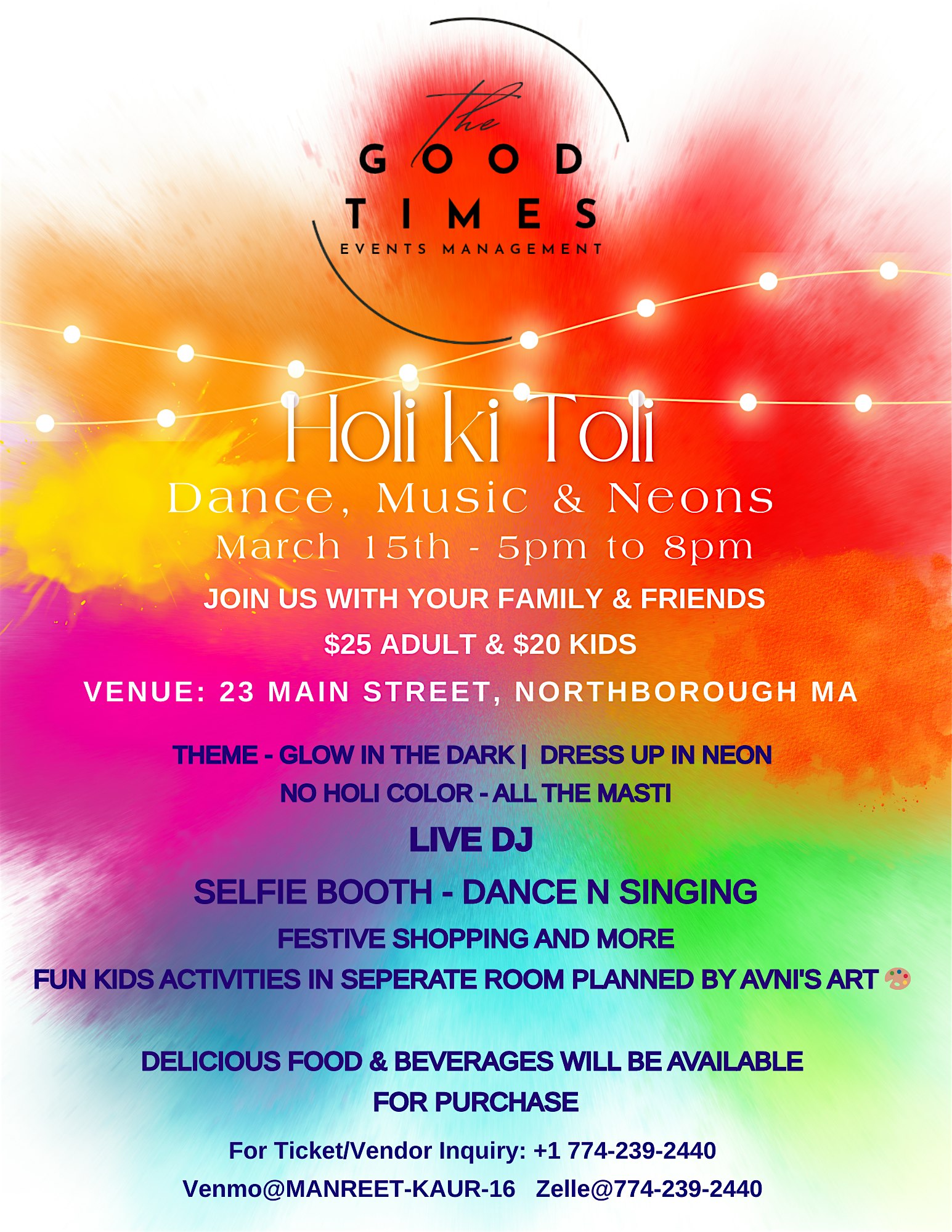 by admin05Mar Holi Ki Toli – The Good Times Events at 23 Main St – Northborough, MA Holi Ki Toli – The Good Times Events at 23 Main St – Northborough, MA 4 4 people viewed this event. Holi Ki Toli!You are invited! Come join us with you friends & family for an Epic Indoor Holi Dance Party! Separate fun activities for kids! Tickets-RSVP Link Date And Time Sunday, March 15th, 2026 05:00 PM (PDT) Venue 23 Main St Location 23 Main Street, Northborough, MA 1532 Event Types Community & CultureParty or Social Gathering Event Category Massachusetts Share With Friends Facebook Twitter Linkedin Xing Pinterest Share This Post: