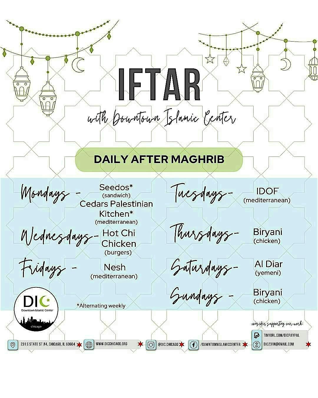 Iftar at DIC at Downtown Islamic Center – Chicago, IL Iftar at DIC at Downtown Islamic Center – Chicago, IL 1 1 people viewed this event. Join us at DIC this Ramadan – Break your fast, build community, and embrace the spirit of unity, reflection, and gratitude Tickets-RSVP Link Register for event Date And Time Sunday, March 15th, 2026 @ 06:00 PM Location 231 South State Street, Chicago, IL 60604 Event Types Dinner or GalaFood & Drink Event Category ChicagoIllinois Share With Friends Facebook Twitter Linkedin Xing Pinterest