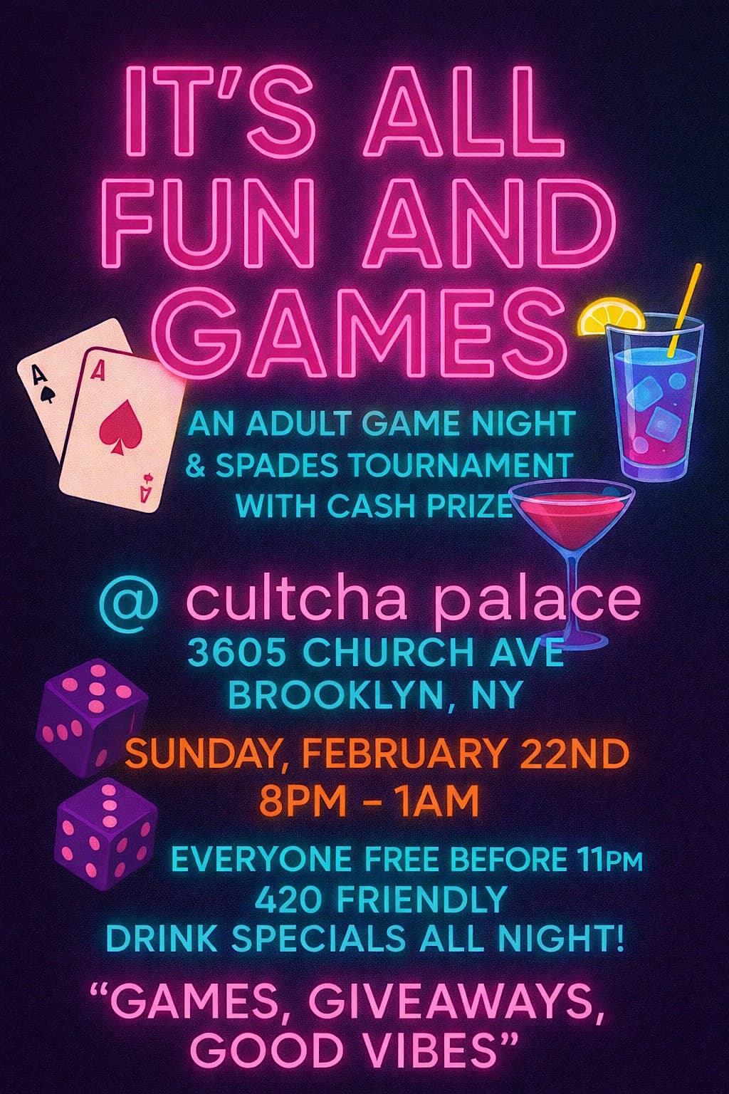 by admin23Feb IT’S ALL FUN AND GAMES at Cultcha Palace – Brooklyn, NY IT’S ALL FUN AND GAMES at Cultcha Palace – Brooklyn, NY 2 2 people viewed this event. ADULT GAME NIGHT AND SPADES TOURNAMENT Tickets-RSVP Link Date And Time Sunday, March 15th, 2026 @ 08:00 PM Location 3605 Church Avenue, Brooklyn, NY 11203 Event Types OtherParty or Social Gathering Event Category New York Share With Friends Facebook Twitter Linkedin Xing Pinterest Share This Post: