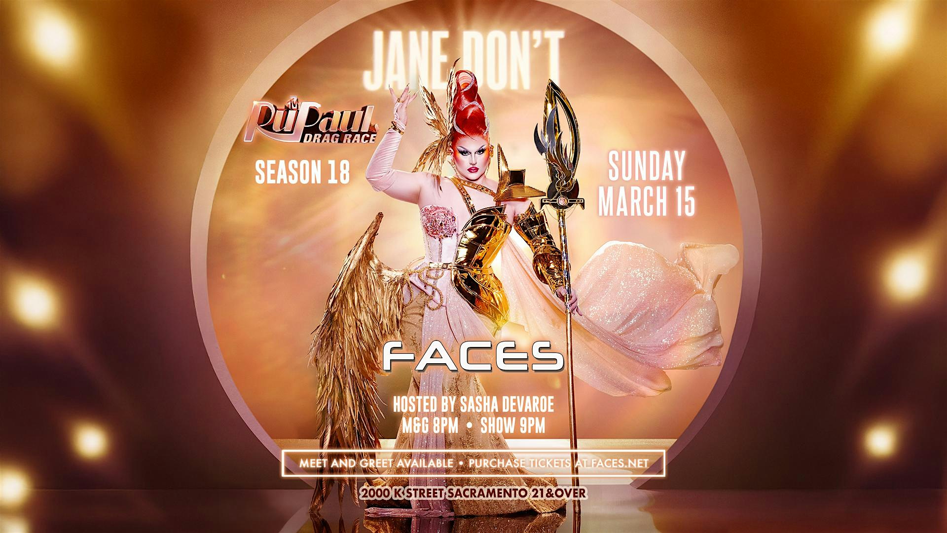 by admin05Mar Jane Don’t in Sacramento at Faces Nightclub – Sacramento, CA Jane Don’t in Sacramento at Faces Nightclub – Sacramento, CA 4 4 people viewed this event. RuPaul’s Drag Race S18 – Jane Don’t in Sacramento live at Faces Nightclub Meet & Greet Tickets Tickets-RSVP Link Date And Time Sunday, March 15th, 2026 07:00 PM (PDT) Venue Faces Nightclub Location 2000 K Street, Sacramento, CA 95811 Event Types Concert or PerformanceFilm, Media & Entertainment Event Category CaliforniaSacramento Share With Friends Facebook Twitter Linkedin Xing Pinterest Share This Post: