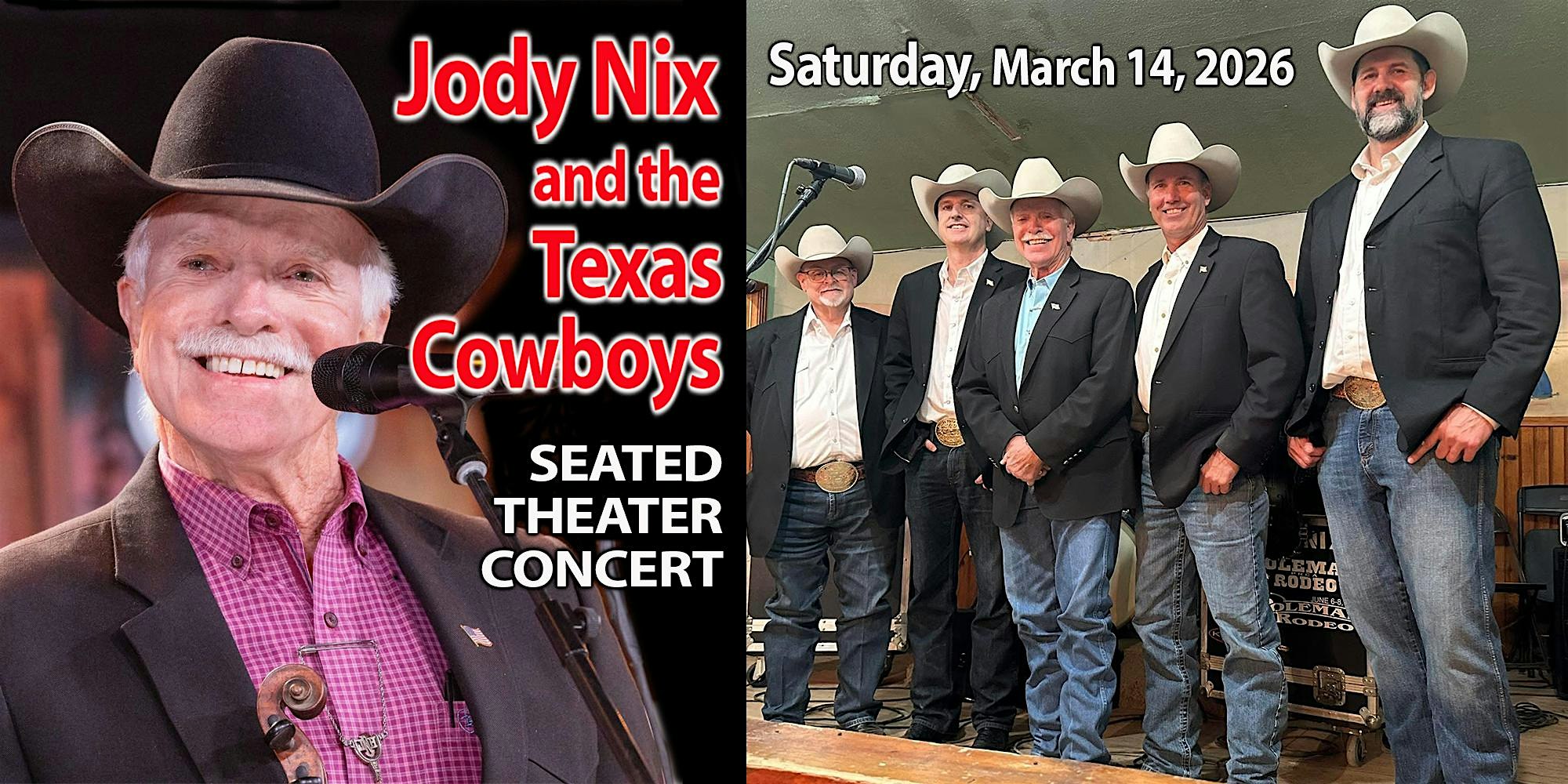 by admin13Feb Jody Nix and the Texas Cowboys – Seated Show – Live at Cactus Theater! at Cactus Theater – Lubbock, TX Jody Nix and the Texas Cowboys – Seated Show – Live at Cactus Theater! at Cactus Theater – Lubbock, TX 1 1 people viewed this event. First Cactus Appearance Tickets-RSVP Link Date And Time Sunday, March 15th, 2026 12:00 AM (PST) Venue Cactus Theater Location 1812 Buddy Holly Ave, Lubbock, TX 79401 Event Types Concert or PerformanceMusic Event Category Texas Share With Friends Facebook Twitter Linkedin Xing Pinterest Share This Post: