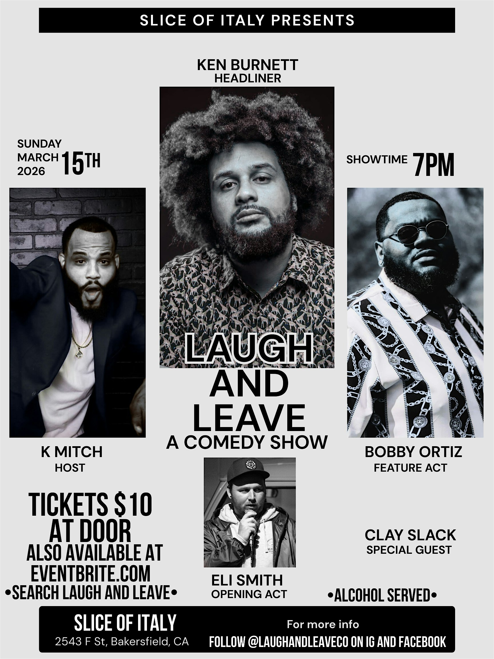 by admin05Mar Laugh and leave at Slice of Italy – Bakersfield, CA Laugh and leave at Slice of Italy – Bakersfield, CA 1 1 people viewed this event. An All-Star cast of Bakersfield’s premiere comedians. Performances by K Mitch, Eli Smith, Clay Slack, Bobby Ortiz and Ken Burnett. Tickets-RSVP Link Date And Time Sunday, March 15th, 2026 07:00 PM (PST) Venue Slice of Italy Location 2543 F Street, Bakersfield, CA 93301 Event Types Party or Social GatheringPerforming & Visual Arts Event Category California Share With Friends Facebook Twitter Linkedin Xing Pinterest Share This Post: