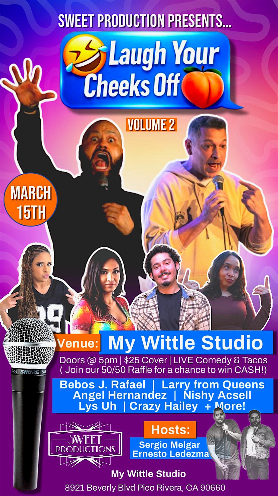 by admin05Mar Laugh Your Cheeks Off. Vol.2 at My Wittle Studio – Pico Rivera, CA Laugh Your Cheeks Off. Vol.2 at My Wittle Studio – Pico Rivera, CA 1 1 people viewed this event. Come join us and laugh your cheeks off with this hilarious lineup of funny comedians. We’ve got the remedy for the times. Tickets-RSVP Link Date And Time Sunday, March 15th, 2026 06:00 PM (PST) Venue My Wittle Studio Location 8921 Beverly Boulevard, Pico Rivera, CA 90660 Event Types Concert or PerformancePerforming & Visual Arts Event Category CaliforniaLos Angeles Share With Friends Facebook Twitter Linkedin Xing Pinterest Share This Post: