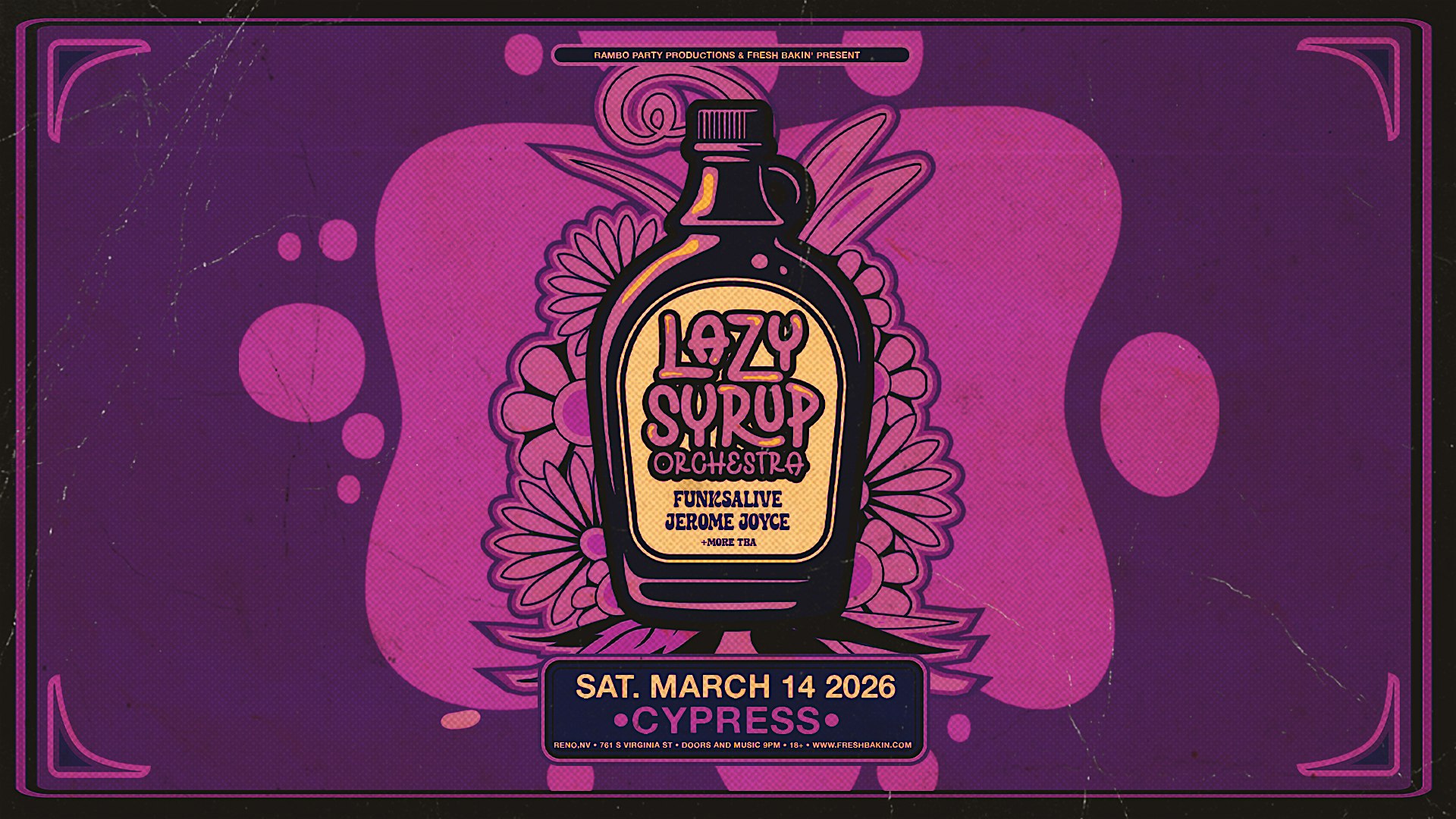 by admin13Feb Lazy Syrup Orchestra at Cypress at Cypress Music Venue & Private Events – Reno, NV Lazy Syrup Orchestra at Cypress at Cypress Music Venue & Private Events – Reno, NV 1 1 people viewed this event. Lazy Syrup Orchestra returns to Cypress in Reno on March 14, 2026. Tickets-RSVP Link Date And Time Sunday, March 15th, 2026 04:00 AM (PST) Venue Cypress Music Venue & Private Events Location 761 South Virginia Street, Reno, NV 89501 Event Types Concert or PerformanceMusic Event Category NevadaReno Share With Friends Facebook Twitter Linkedin Xing Pinterest Share This Post: