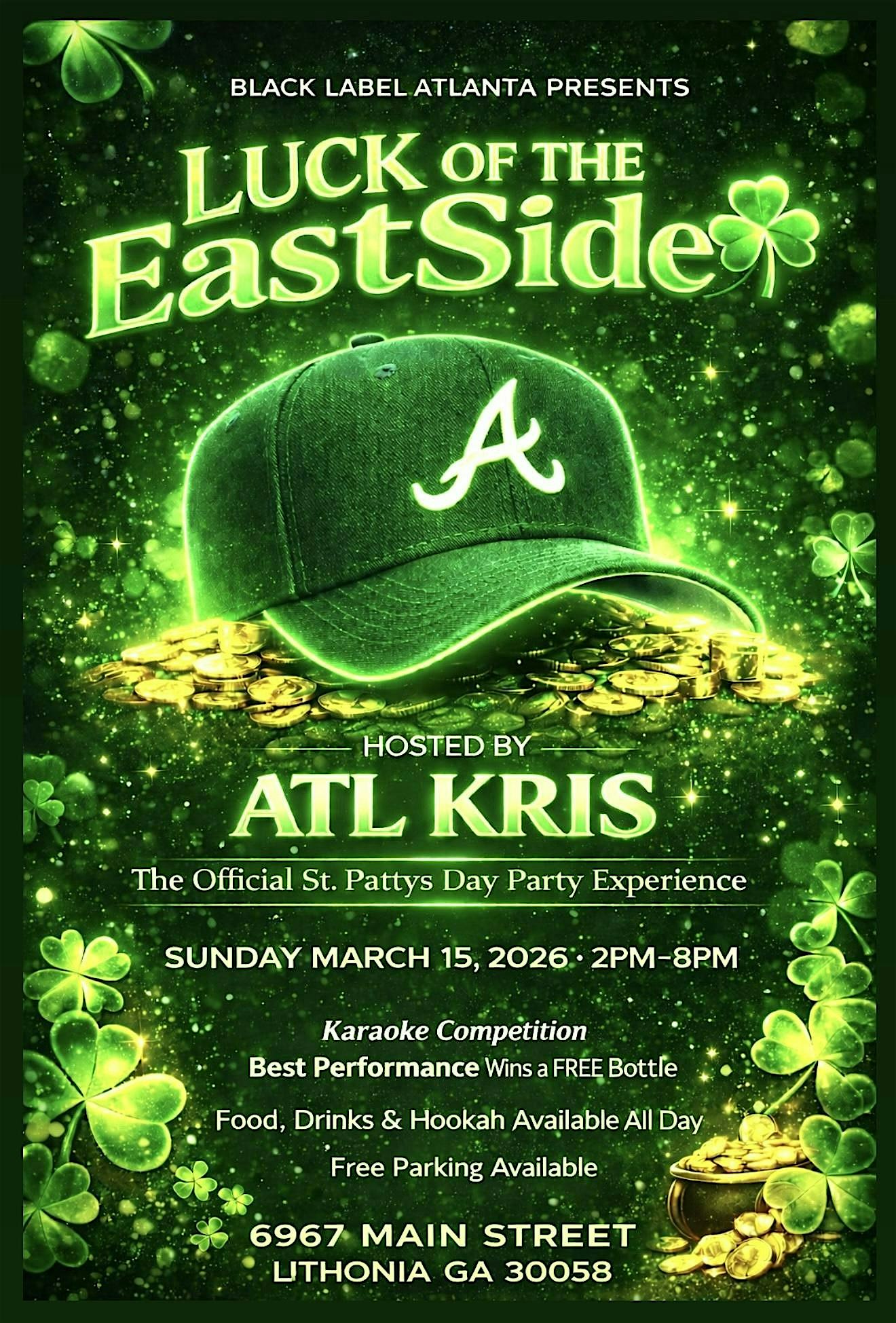 by admin05Mar Luck of the EastSide at 6967 Main St – Lithonia, GA Luck of the EastSide at 6967 Main St – Lithonia, GA 2 2 people viewed this event. The official ‘St. Pattys Day’ Brunch Day Party #KaraokeEdition hosted by ATL Kris! Tickets-RSVP Link Date And Time Sunday, March 15th, 2026 02:00 PM (PST) Venue 6967 Main St Location 6967 Main Street, Lithonia, GA 30058 Event Types Party or Social GatheringSeasonal & Holiday Event Category Georgia Share With Friends Facebook Twitter Linkedin Xing Pinterest Share This Post: