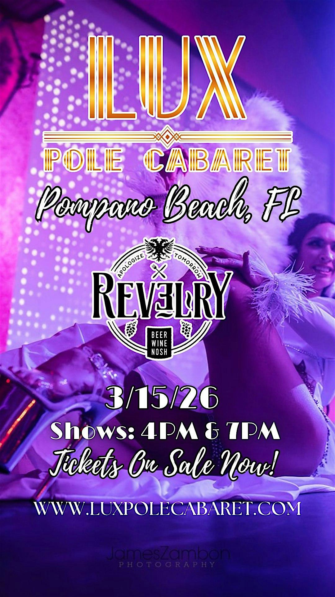 by admin05Mar LUX Pole Cabaret | 3/15 Revelry, Pompano Beach (Doors 4pm Show 4:30 Sunday) at Revelry – Pompano Beach, FL LUX Pole Cabaret | 3/15 Revelry, Pompano Beach (Doors 4pm Show 4:30 Sunday) at Revelry – Pompano Beach, FL 1 1 people viewed this event. LUX POLE CABARET ~ Revelry Treat yourself to a Dazzling and Luxurious Pole Arts Cabaret! Tickets-RSVP Link Date And Time Sunday, March 15th, 2026 04:00 PM (PST) Venue Revelry Location 227 South Federal Highway, Pompano Beach, FL 33062 Event Types Concert or PerformancePerforming & Visual Arts Event Category Florida Share With Friends Facebook Twitter Linkedin Xing Pinterest Share This Post: