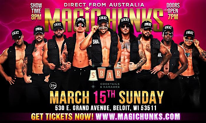 by admin05Mar MAGIC HUNKS® AUSTRALIA TAKEOVER IN BELOIT, WI, USA!!! at 5BAR – Beloit, WI MAGIC HUNKS® AUSTRALIA TAKEOVER IN BELOIT, WI, USA!!! at 5BAR – Beloit, WI 1 1 people viewed this event. Australia’s #1 Ladies Night Event Is Coming to Beloit! Limited Tickets On Sale NOW! Open to Ages 21+ Doors open at 7pm Tickets-RSVP Link Date And Time Sunday, March 15th, 2026 08:00 PM (PST) Venue 5BAR Location 530 East Grand Avenue, Beloit, WI 53511 Event Types Concert or PerformancePerforming & Visual Arts Event Category Wisconsin Share With Friends Facebook Twitter Linkedin Xing Pinterest Share This Post:
