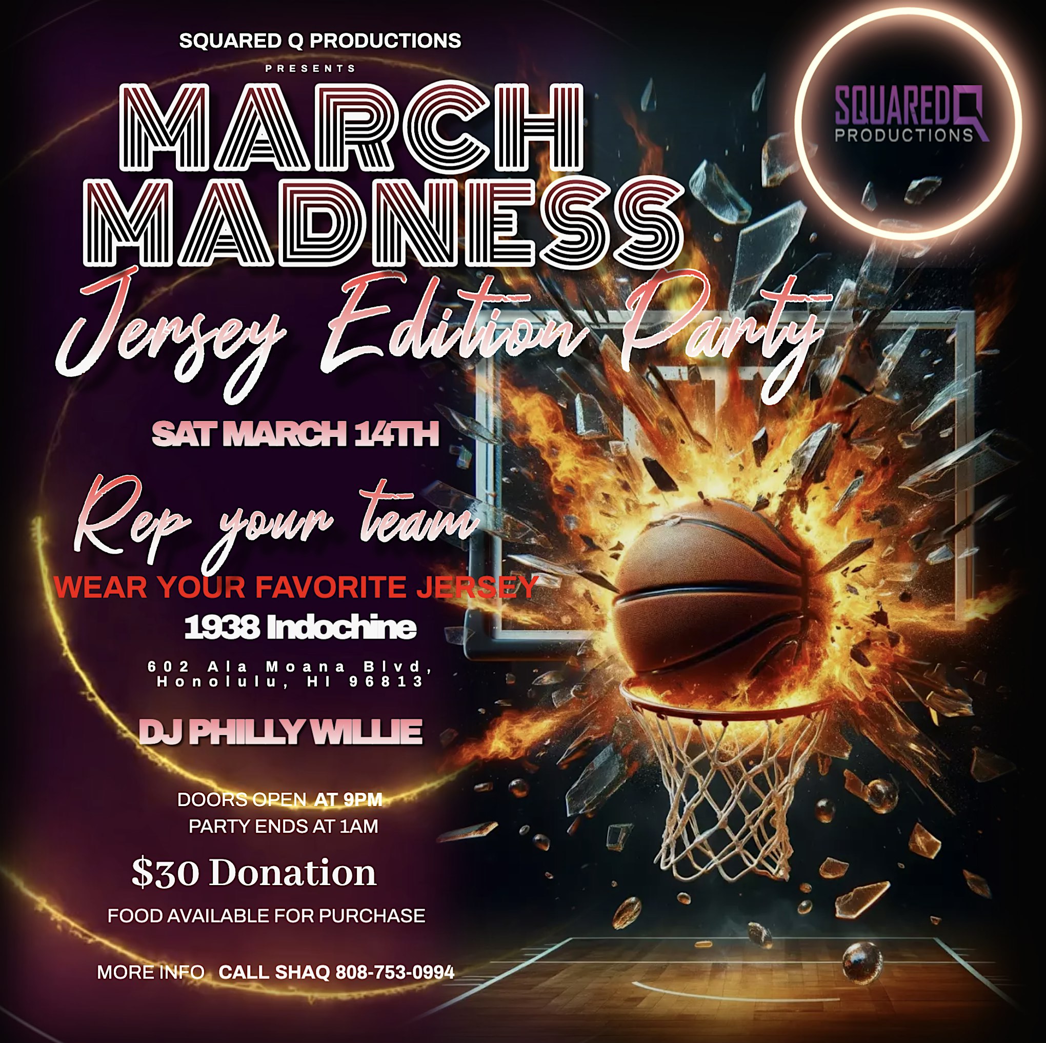 by admin13Feb March Madness Jersey Edition Party at 1938 Indochine – Honolulu, HI March Madness Jersey Edition Party at 1938 Indochine – Honolulu, HI 2 2 people viewed this event. March Madness Jersey Edition! Jerseys on, brackets busted & DJ Philly Willie spinning ALL night Tickets-RSVP Link Date And Time Sunday, March 15th, 2026 07:00 AM (PST) Venue 1938 Indochine Location 602 Ala Moana Boulevard, Honolulu, HI 96813 Event Types Food & DrinkParty or Social Gathering Event Category HawaiiHonolulu Share With Friends Facebook Twitter Linkedin Xing Pinterest Share This Post: