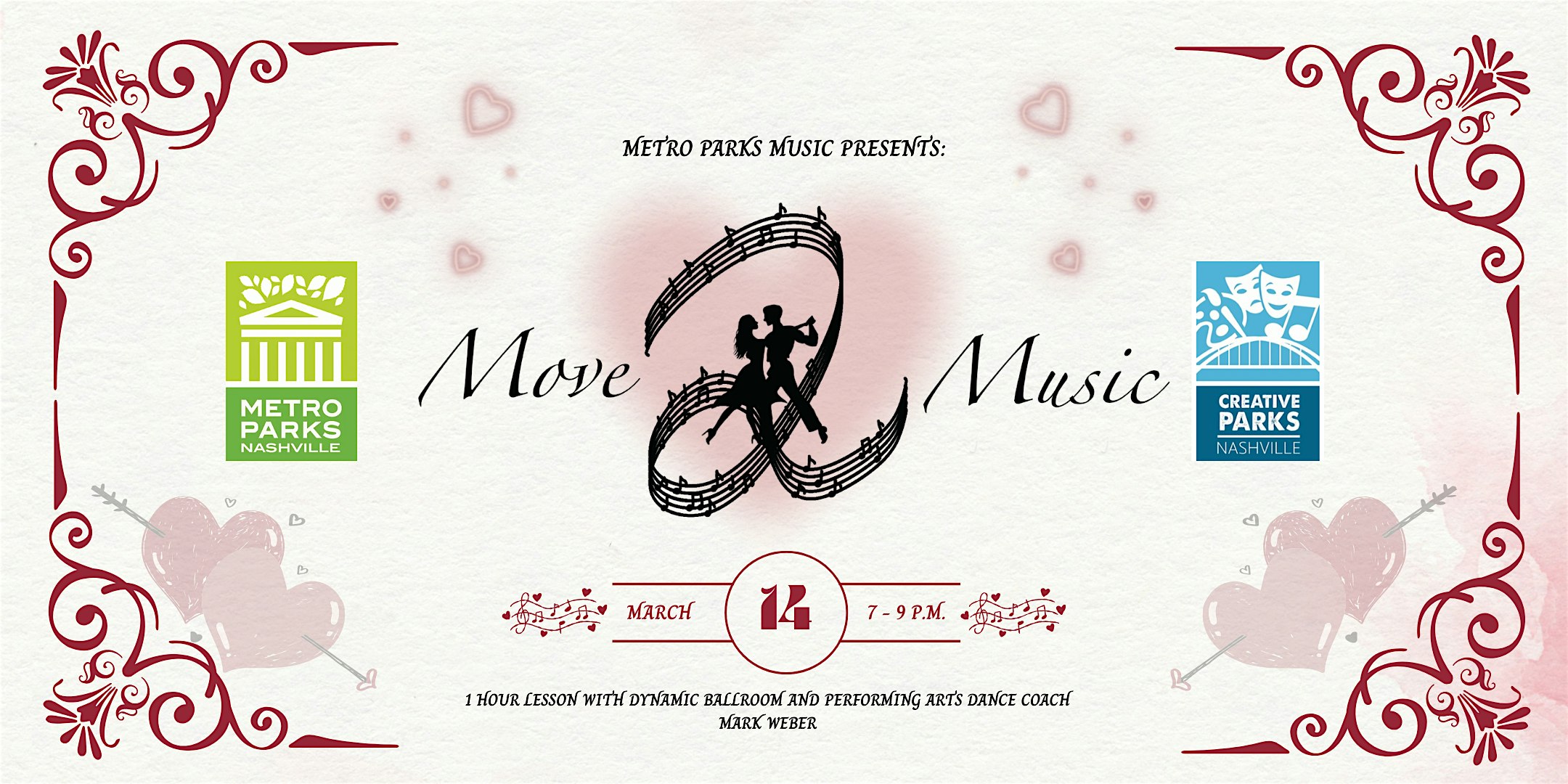 by admin13Feb Move 2 Music at Sevier Park Community Center – Nashville, TN Move 2 Music at Sevier Park Community Center – Nashville, TN 1 1 people viewed this event. Join Creative Parks Nashville and Metro Parks Music for “Move 2 Music” for 1-hr l dance lesson, refreshments and dancing. Tickets-RSVP Link Date And Time Sunday, March 15th, 2026 12:00 AM (PST) Venue Sevier Park Community Center Location 3021 Lealand Lane, Nashville, TN 37204 Event Types Music Event Category NashvilleTennessee Share With Friends Facebook Twitter Linkedin Xing Pinterest Share This Post: