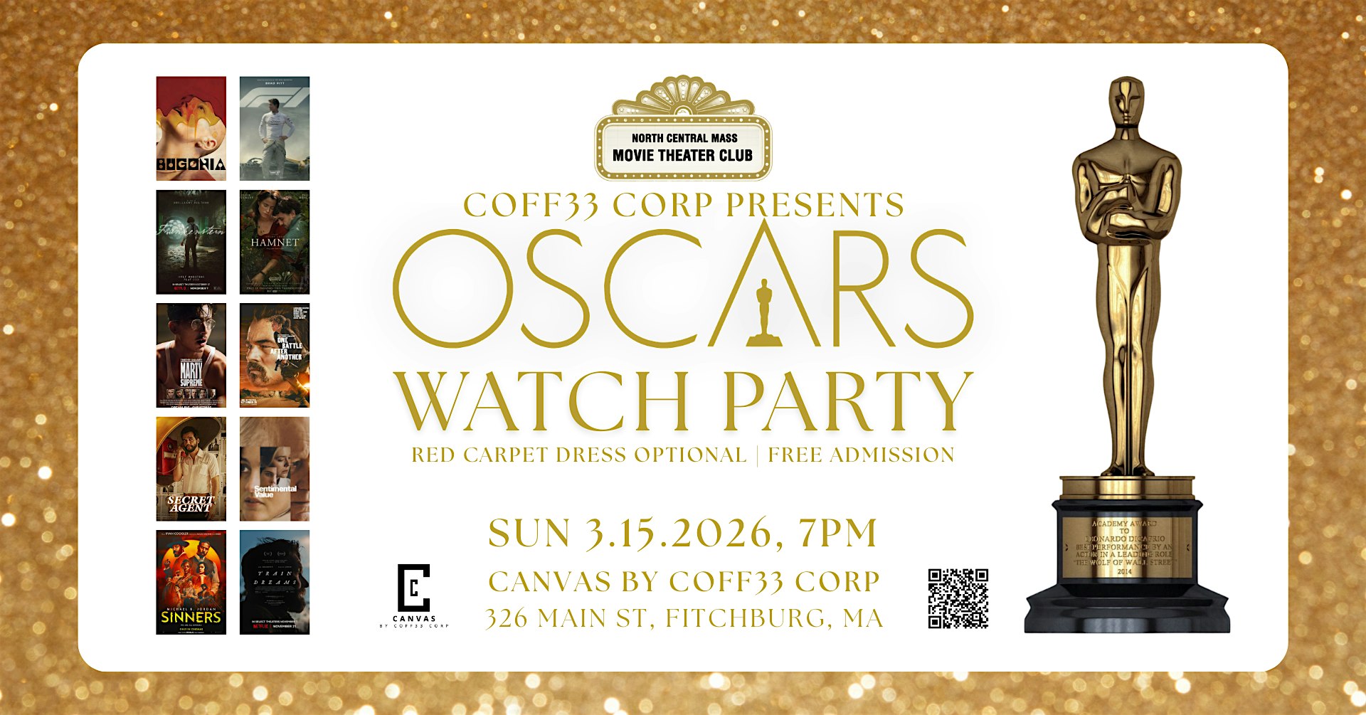 by admin05Mar Oscar Party @ Canvas by CoFF33 Corp at CANVAS by CoFF33 Corp – Fitchburg, MA Oscar Party @ Canvas by CoFF33 Corp at CANVAS by CoFF33 Corp – Fitchburg, MA 3 3 people viewed this event. Walk the Red Carpet and enjoy the show. Will your favorite films of 2025 win? Tickets-RSVP Link Date And Time Sunday, March 15th, 2026 07:00 PM (PST) Venue CANVAS by CoFF33 Corp Location 326 Main Street, Fitchburg, MA 1420 Event Types Film, Media & EntertainmentParty or Social Gathering Event Category Massachusetts Share With Friends Facebook Twitter Linkedin Xing Pinterest Share This Post: