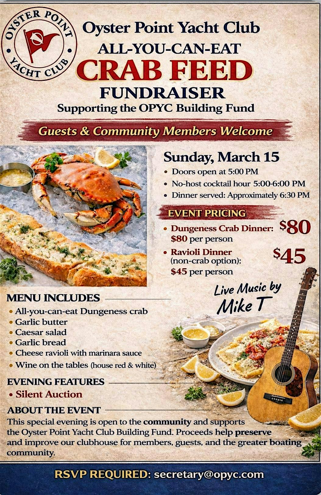 by admin24Feb Oyster Point Yacht Club Crab Feed at 911 Marina Blvd – South San Francisco, CA Oyster Point Yacht Club Crab Feed at 911 Marina Blvd – South San Francisco, CA 2 2 people viewed this event. All-You-Can-Eat Dungeness Crab, live music, and a fun waterfront evening — all in support of the Oyster Point Yacht Club Building Fund. Tickets-RSVP Link Date And Time Sunday, March 15th, 2026 05:00 PM (PST) Venue 911 Marina Blvd Location 911 Marina Boulevard, South San Francisco, CA 94080 Event Types Food & Drink Event Category CaliforniaSan Francisco Share With Friends Facebook Twitter Linkedin Xing Pinterest Share This Post: