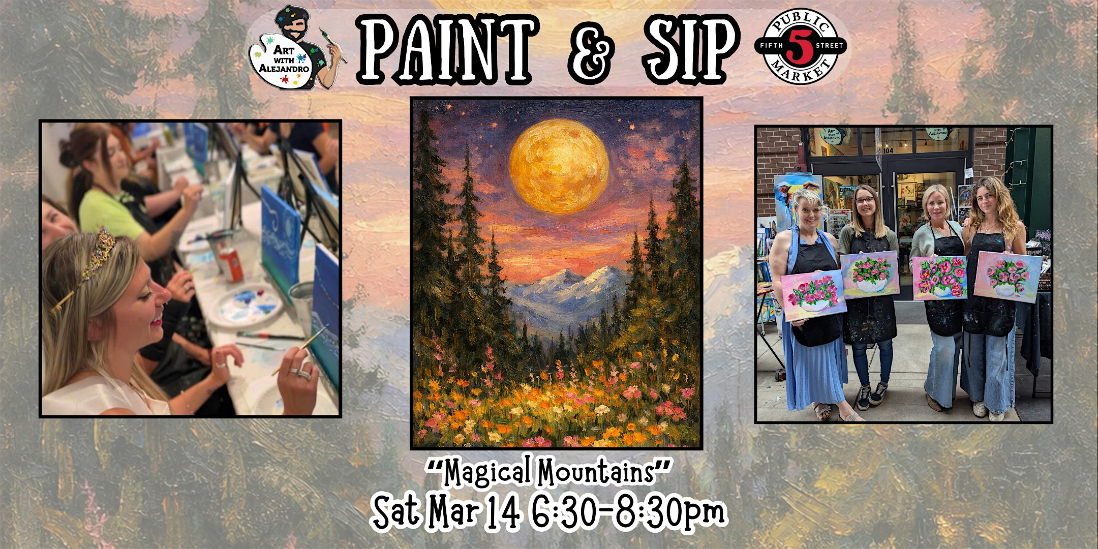 by admin13Feb Paint & Sip at 5th St Alley “Magical Mountains” at Art with Alejandro – Eugene, OR Paint & Sip at 5th St Alley “Magical Mountains” at Art with Alejandro – Eugene, OR 3 3 people viewed this event. Join us for a fun, creative afternoon. All skill levels welcome. Materials provided & BYOB Tickets-RSVP Link Date And Time Sunday, March 15th, 2026 01:00 AM (PST) Venue Art with Alejandro Location 590 Pearl St, Eugene, OR 97401 Event Types Party or Social GatheringPerforming & Visual Arts Event Category EugeneOregon Share With Friends Facebook Twitter Linkedin Xing Pinterest Share This Post: