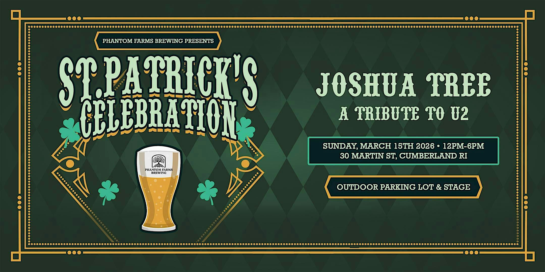 by admin13Feb Phantom Farms Brewing Presents: St Patrick’s Celebration at Phantom Farms Brewing – Cumberland, RI Phantom Farms Brewing Presents: St Patrick’s Celebration at Phantom Farms Brewing – Cumberland, RI 1 1 people viewed this event. Annual Outdoor St Paddy’s Day Celebration on the main stage with beer, music, food & GOOD PEOPLE Tickets-RSVP Link Date And Time Sunday, March 15th, 2026 04:00 PM (PST) Venue Phantom Farms Brewing Location 30 Martin Street, Cumberland, RI 2864 Event Types Concert or PerformanceMusic Event Category Rhode Island Share With Friends Facebook Twitter Linkedin Xing Pinterest Share This Post:
