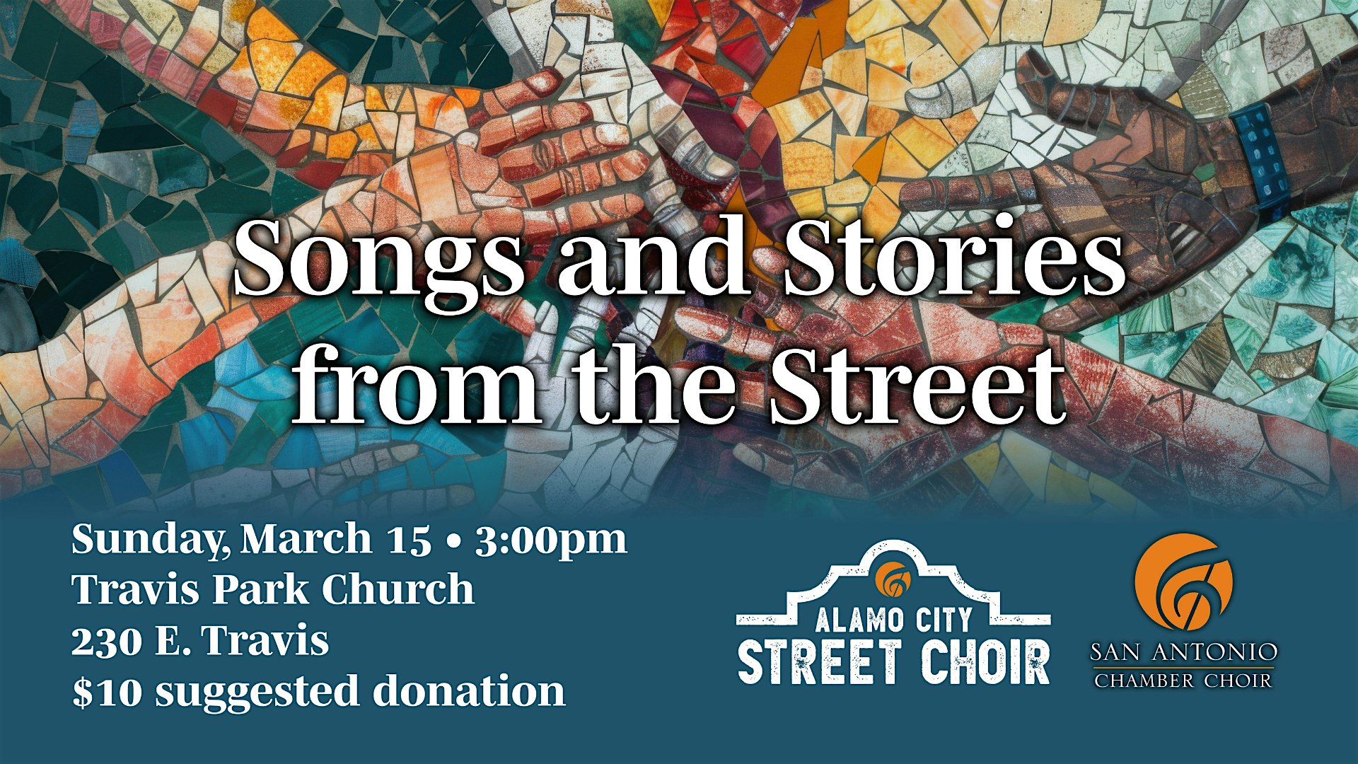 Songs & Stories from the Street at Travis Park United Methodist Church – San Antonio, TX Songs & Stories from the Street at Travis Park United Methodist Church – San Antonio, TX 1 1 people viewed this event. Alamo City Street Choir Concert & Fundraiser Celebrates Music, Storytelling, and Strength of Community Tickets-RSVP Link Register for event Date And Time Sunday, March 15th, 2026 @ 03:00 PM Location 230 East Travis Street, San Antonio, TX 78205 Event Types Concert or PerformanceMusic Event Category San AntonioTexas Share With Friends Facebook Twitter Linkedin Xing Pinterest