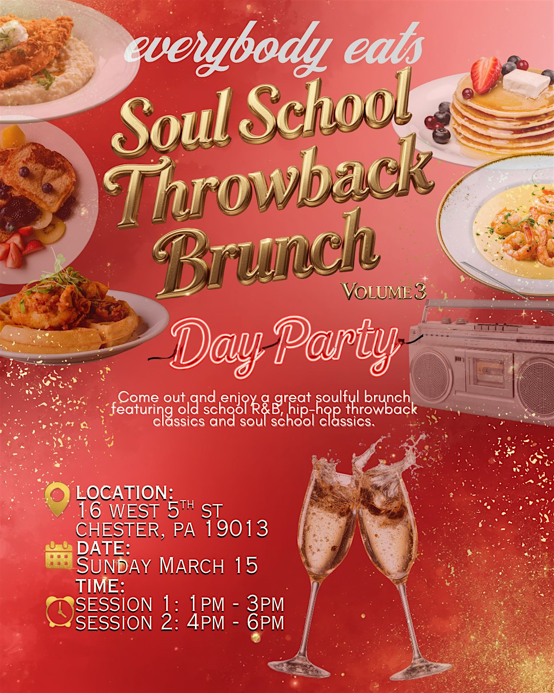 by admin27Feb Soul School Throwback Brunch Vol 3 – Session 2 at Everybody Eats – Chester, PA Soul School Throwback Brunch Vol 3 – Session 2 at Everybody Eats – Chester, PA 1 1 people viewed this event. Kick back and vibe with throwback jams and tasty brunch bites at Soul School Vol 3! Tickets-RSVP Link Date And Time Sunday, March 15th, 2026 04:00 PM (PST) Venue Everybody Eats Location 16 West 5th Street, Chester, PA 19013 Event Types Music Event Category Pennsylvania Share With Friends Facebook Twitter Linkedin Xing Pinterest Share This Post: