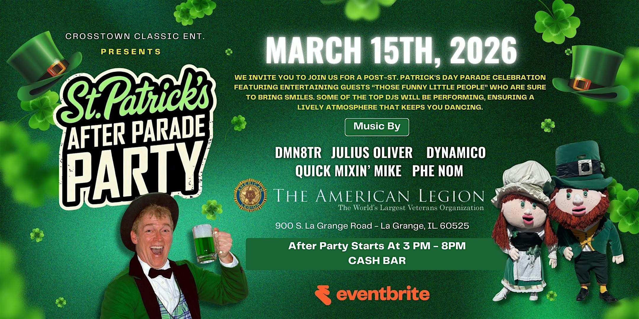 by admin13Feb St. Patrick’s After Parade Party! ☘️☘️☘️ at American Legion Post 1941 – La Grange, IL St. Patrick’s After Parade Party! ☘️☘️☘️ at American Legion Post 1941 – La Grange, IL 1 1 people viewed this event. We invite you to join us on March 15, 2026, for a post-St. Patrick’s Day Parade celebration featuring entertaining guests “Those funny littl Tickets-RSVP Link Date And Time Sunday, March 15th, 2026 07:00 PM (PST) Venue American Legion Post 1941 Location 900 LaGrange Road, La Grange, IL 60525 Event Types Party or Social GatheringSeasonal & Holiday Event Category Illinois Share With Friends Facebook Twitter Linkedin Xing Pinterest Share This Post: