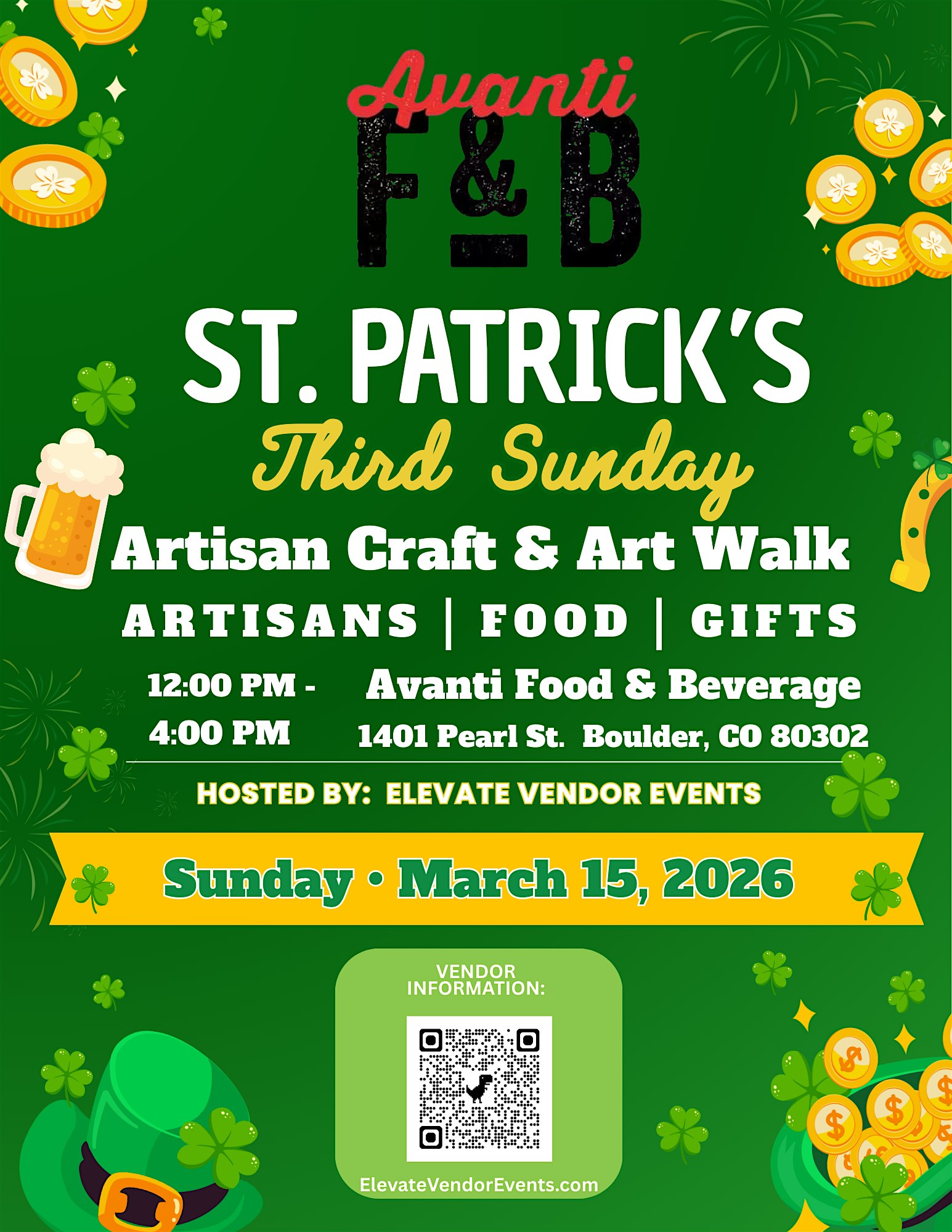 by admin27Feb St. Patrick’s Artisan Market at Avanti – Boulder – Free Entry at Avanti Food and Beverage Boulder – Boulder, CO St. Patrick’s Artisan Market at Avanti – Boulder – Free Entry at Avanti Food and Beverage Boulder – Boulder, CO 1 1 people viewed this event. Celebrate St. Patrick’s Day with local artisans, handmade goods, food, drinks & free entry at Avanti in Boulder! Tickets-RSVP Link Date And Time Sunday, March 15th, 2026 12:00 PM (PST) Venue Avanti Food and Beverage Boulder Location 1401 Pearl Street, Boulder, CO 80302 Event Types Festival or FairFood & Drink Event Category BoulderColorado Share With Friends Facebook Twitter Linkedin Xing Pinterest Share This Post: