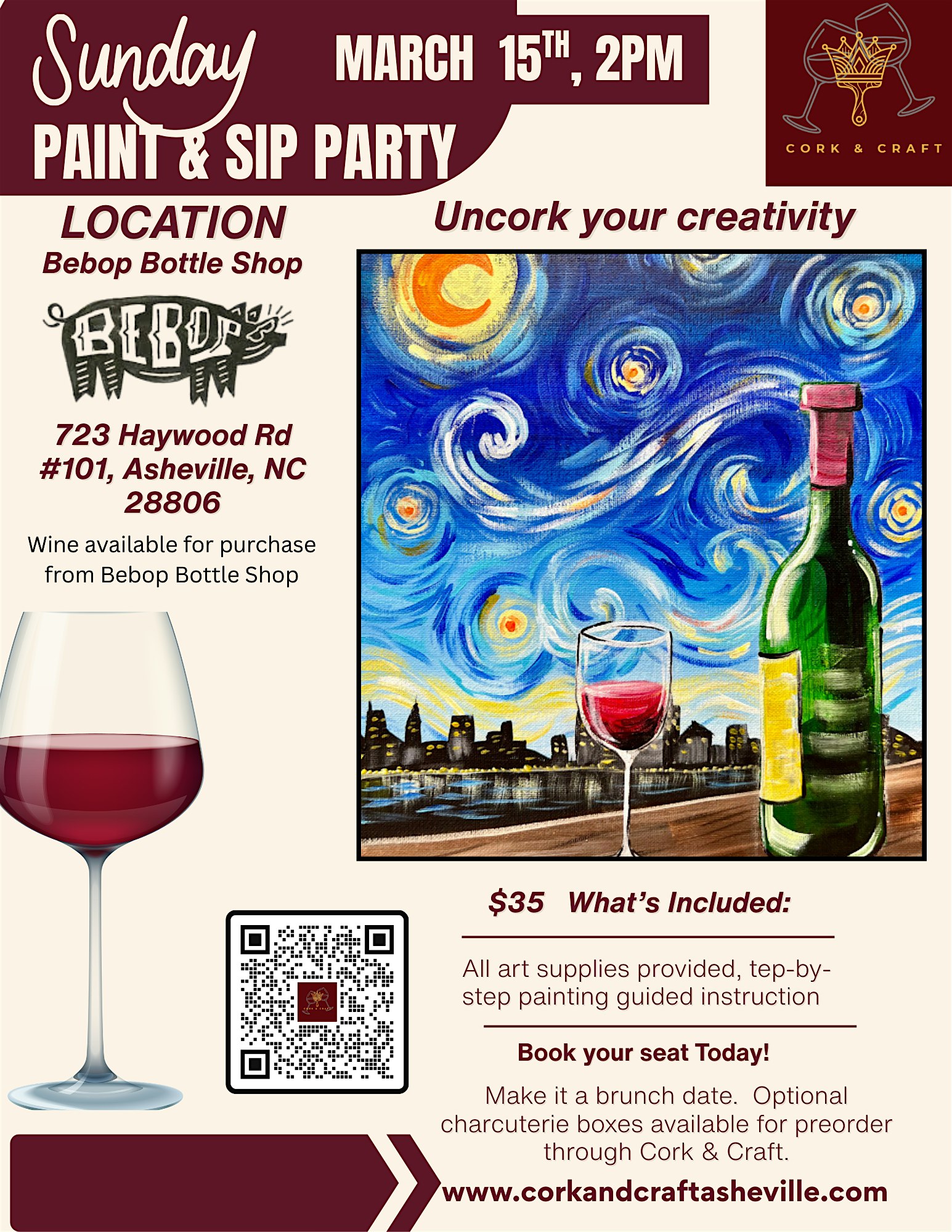 by admin27Feb Sunday Funday Wine & Paint at Bebop Bottle Shop – Asheville, NC Sunday Funday Wine & Paint at Bebop Bottle Shop – Asheville, NC 1 1 people viewed this event. Join Cork & Craft for a relaxed Sunday afternoon of wine, creativity, and Van Gogh inspired painting at Bebop Bottle Shop in Asheville. Tickets-RSVP Link Date And Time Sunday, March 15th, 2026 @ 02:00 PM Location 723 Haywood Road, Asheville, NC 28806 Event Types Party or Social Gathering Event Category North Carolina Share With Friends Facebook Twitter Linkedin Xing Pinterest Share This Post: