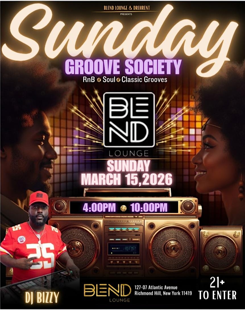 by admin05Mar Sunday Groove Society at BLEND LOUNGE – Queens, NY Sunday Groove Society at BLEND LOUNGE – Queens, NY 1 1 people viewed this event. “Sunday Groove Society is a curated lounge experience featuring R&B, Soul & classic grooves. Free Entry with RSVP Tickets-RSVP Link Date And Time Sunday, March 15th, 2026 04:00 PM (PST) Venue BLEND LOUNGE Location 127-07 Atlantic Avenue, Queens, NY 11419 Event Types Concert or PerformanceMusic Event Category New YorkNew York City Share With Friends Facebook Twitter Linkedin Xing Pinterest Share This Post: