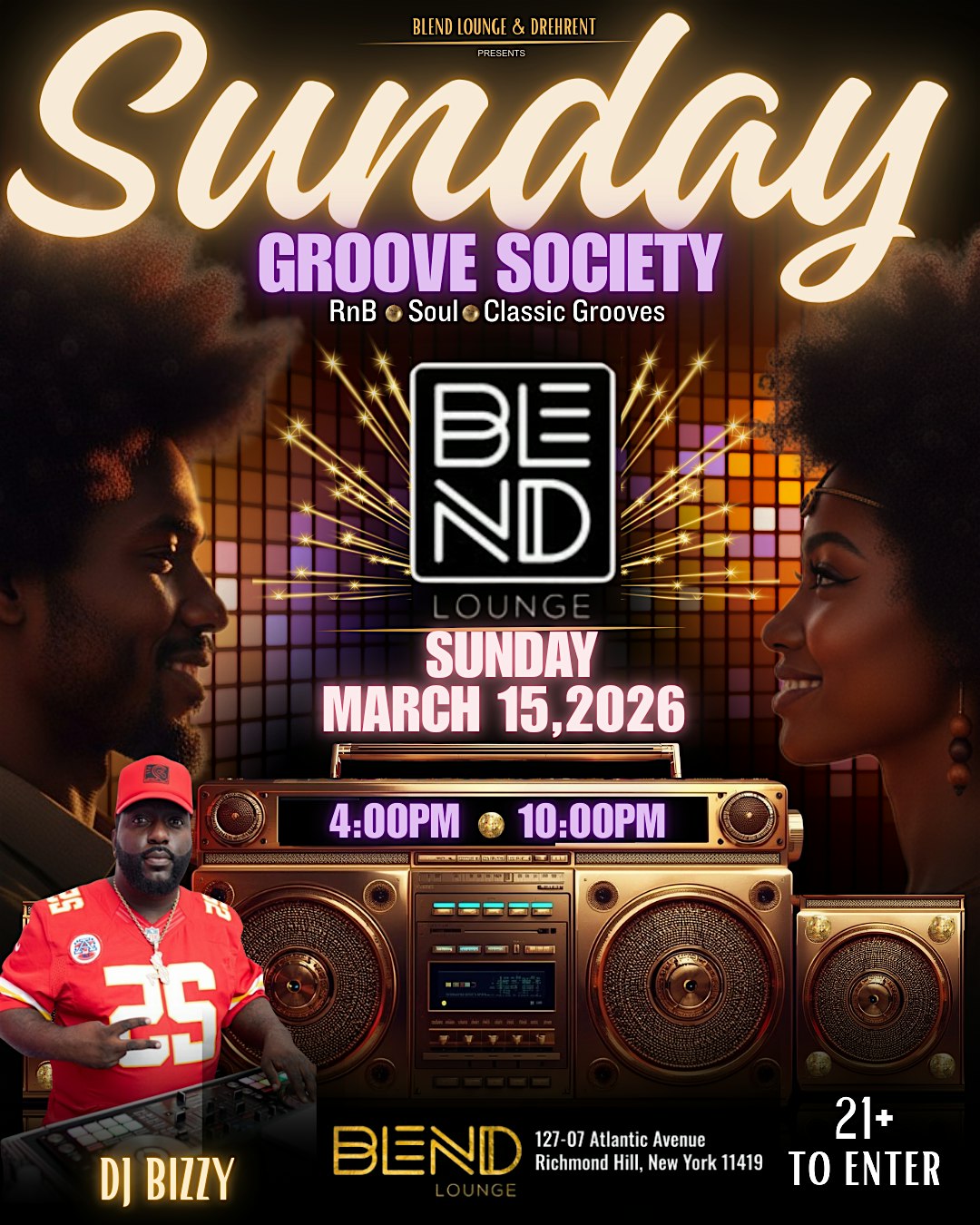 by admin13Feb SUNDAY GROOVE SOCIETY at BLEND LOUNGE – Queens, NY SUNDAY GROOVE SOCIETY at BLEND LOUNGE – Queens, NY 1 1 people viewed this event. FREE ENTRY WITH RSVP Tickets-RSVP Link Date And Time Sunday, March 15th, 2026 08:00 PM (PST) Venue BLEND LOUNGE Location 127-07 Atlantic Avenue, Queens, NY 11419 Event Types Concert or PerformanceMusic Event Category New YorkNew York City Share With Friends Facebook Twitter Linkedin Xing Pinterest Share This Post: