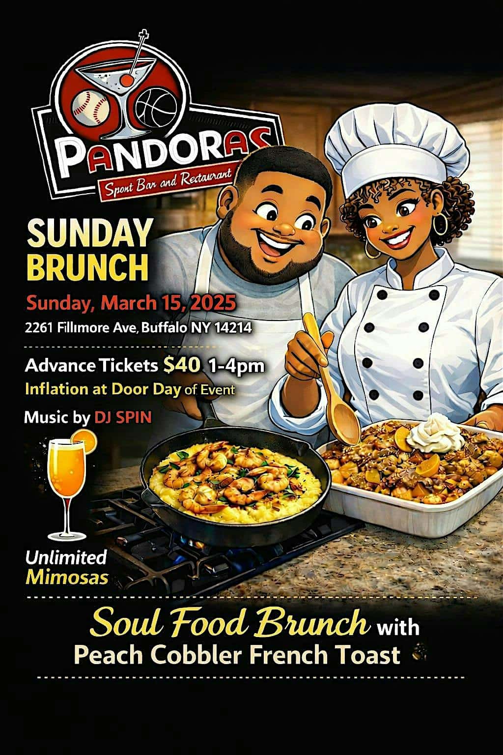 by admin23Feb Sunday R&B Brunch at Pandora’s Sports Bar & Restaurant – Buffalo, NY Sunday R&B Brunch at Pandora’s Sports Bar & Restaurant – Buffalo, NY 1 1 people viewed this event. Sunday Funday, Soulfood Brunch with R&B music…and Free Mimosas… Tickets-RSVP Link Date And Time Sunday, March 15th, 2026 01:00 PM (PST) Venue Pandora's Sports Bar & Restaurant Location 2261 Fillmore Avenue, Buffalo, NY 14214 Event Types MusicParty or Social Gathering Event Category BuffaloNew York Share With Friends Facebook Twitter Linkedin Xing Pinterest Share This Post:
