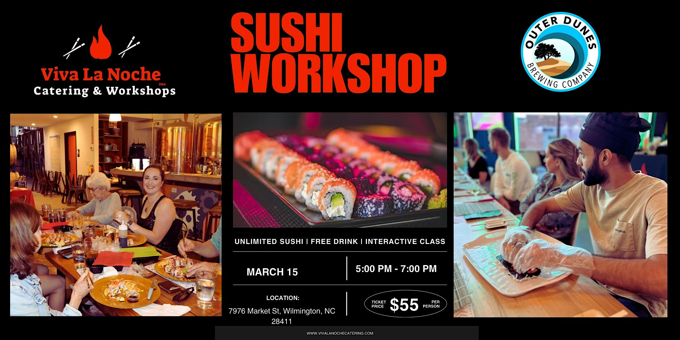by admin27Feb Sushi Workshop Outer Dunes Brewing Company at Outer Dunes Brewing Company – Wilmington, NC Sushi Workshop Outer Dunes Brewing Company at Outer Dunes Brewing Company – Wilmington, NC 1 1 people viewed this event. Join Viva La Noche’s sushi revolution! Learn traditional techniques & create your own rolls in a fun, hands-on class! Tickets-RSVP Link Date And Time Sunday, March 15th, 2026 05:00 PM (PST) Venue Outer Dunes Brewing Company Location 7976 Market Street, Wilmington, NC 28411 Event Types Food & Drink Event Category North Carolina Share With Friends Facebook Twitter Linkedin Xing Pinterest Share This Post: