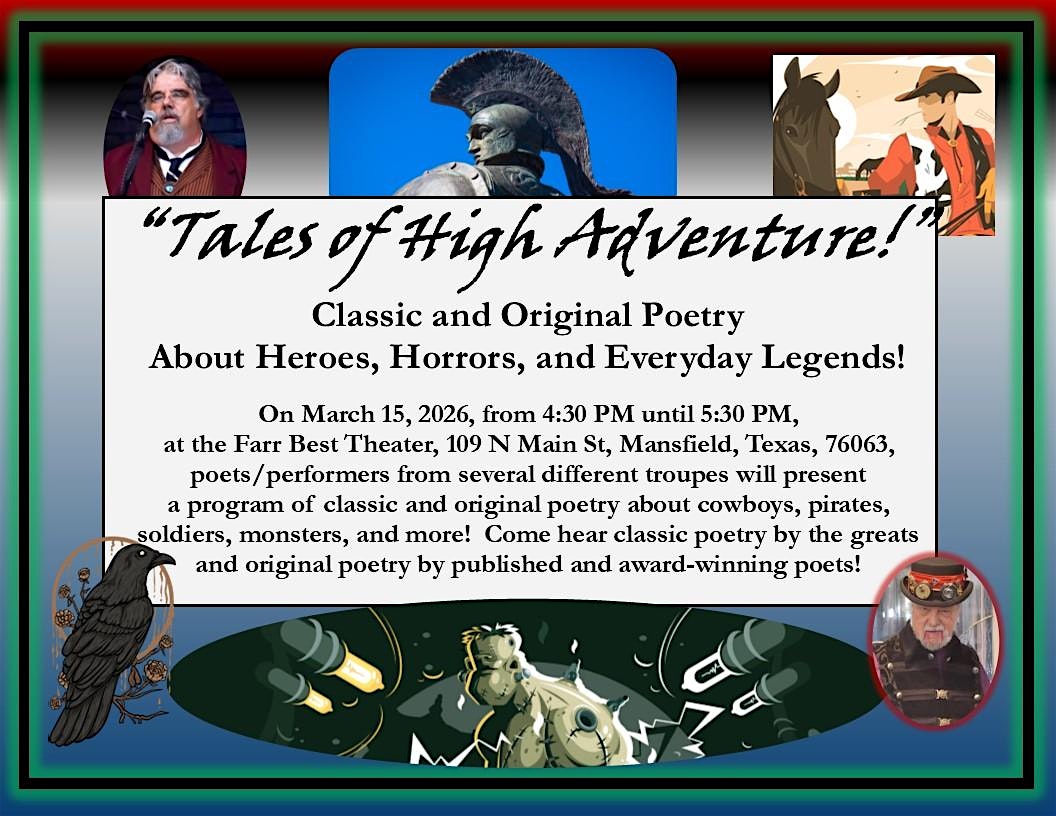 by admin05Mar Tales Of High Adventure: Presented By The Fort Worth Poetry Society at Farr Best Theater – Mansfield, TX Tales Of High Adventure: Presented By The Fort Worth Poetry Society at Farr Best Theater – Mansfield, TX 2 2 people viewed this event. Join us for swashbuckling fun and wild verse at Tales Of High Adventure Pirate Poets—pirates and poetry collide! Tickets-RSVP Link Date And Time Sunday, March 15th, 2026 03:00 PM (PST) Venue Farr Best Theater Location 109 North Main Street, Mansfield, TX 76063 Event Types Concert or PerformancePerforming & Visual Arts Event Category Texas Share With Friends Facebook Twitter Linkedin Xing Pinterest Share This Post: