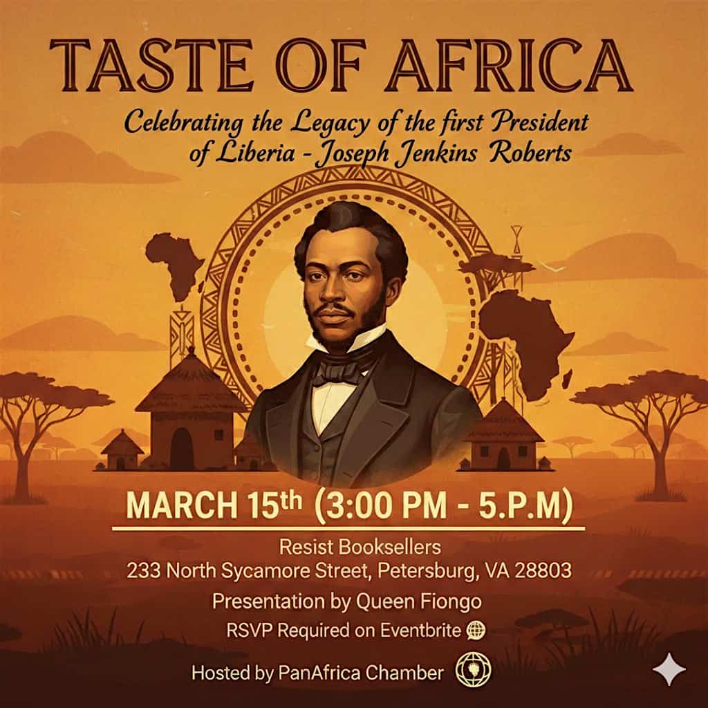 by admin24Feb Taste of Africa at Resist Booksellers – Petersburg, VA – Petersburg, VA Taste of Africa at Resist Booksellers – Petersburg, VA – Petersburg, VA 1 1 people viewed this event. Join us on March 15th as we honor the incredible legacy of Joseph Jenkins Roberts, the first President of Liberia. Tickets-RSVP Link Date And Time Sunday, March 15th, 2026 03:00 PM (PST) Venue Resist Booksellers - Petersburg, VA Location 233 North Sycamore Street, Petersburg, VA 23803 Event Types Festival or FairFood & Drink Event Category Virginia Share With Friends Facebook Twitter Linkedin Xing Pinterest Share This Post: