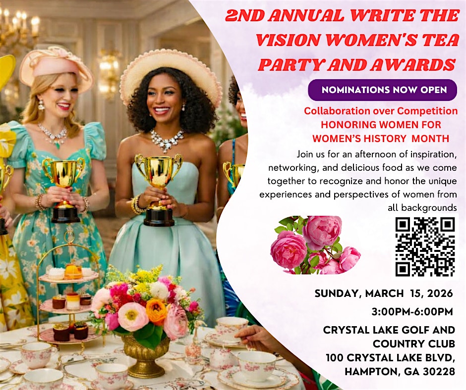 by admin13Feb The 2nd Annual Write the Vision Awards Tea Party at Crystal Lake Golf & Country Club – Hampton, GA The 2nd Annual Write the Vision Awards Tea Party at Crystal Lake Golf & Country Club – Hampton, GA 2 2 people viewed this event. Join us for a fabulous ea Party celebrating visionaries who are making their dreams a reality at the Write the Vision Awards! Tickets-RSVP Link Date And Time Sunday, March 15th, 2026 07:00 PM (PST) Venue Crystal Lake Golf & Country Club Location 100 Crystal Lake Boulevard, Hampton, GA 30228 Event Types Party or Social GatheringPerforming & Visual Arts Event Category Georgia Share With Friends Facebook Twitter Linkedin Xing Pinterest Share This Post: