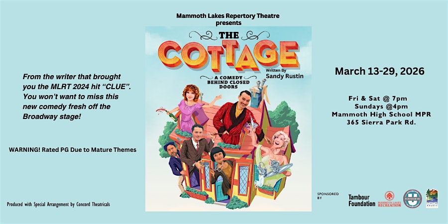 by admin05Mar The Cottage at Mammoth High School MPR – Mammoth Lakes, CA The Cottage at Mammoth High School MPR – Mammoth Lakes, CA 2 2 people viewed this event. The Cottage is a witty farce about romance, sex, marriage, infidelity, faith, identity, and … love. Tickets-RSVP Link Date And Time Sunday, March 15th, 2026 04:00 PM (PST) Venue Mammoth High School MPR Location 365 Sierra Park Road, Mammoth Lakes, CA 93546 Event Types Concert or PerformancePerforming & Visual Arts Event Category California Share With Friends Facebook Twitter Linkedin Xing Pinterest Share This Post: