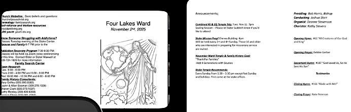by admin13Feb Ward Bulletin at The Church of Jesus Christ of Latter-day Saints – Cheney, WA Ward Bulletin at The Church of Jesus Christ of Latter-day Saints – Cheney, WA 1 1 people viewed this event. Weekly Sunday Ward Bulletin. Find upcoming events, speakers, and hymns. Tickets-RSVP Link Date And Time Sunday, March 15th, 2026 05:00 PM (PST) Venue The Church of Jesus Christ of Latter-day Saints Location 10405 West Melville Road, Cheney, WA 99004 Event Types Music Event Category SpokaneWashington Share With Friends Facebook Twitter Linkedin Xing Pinterest Share This Post: