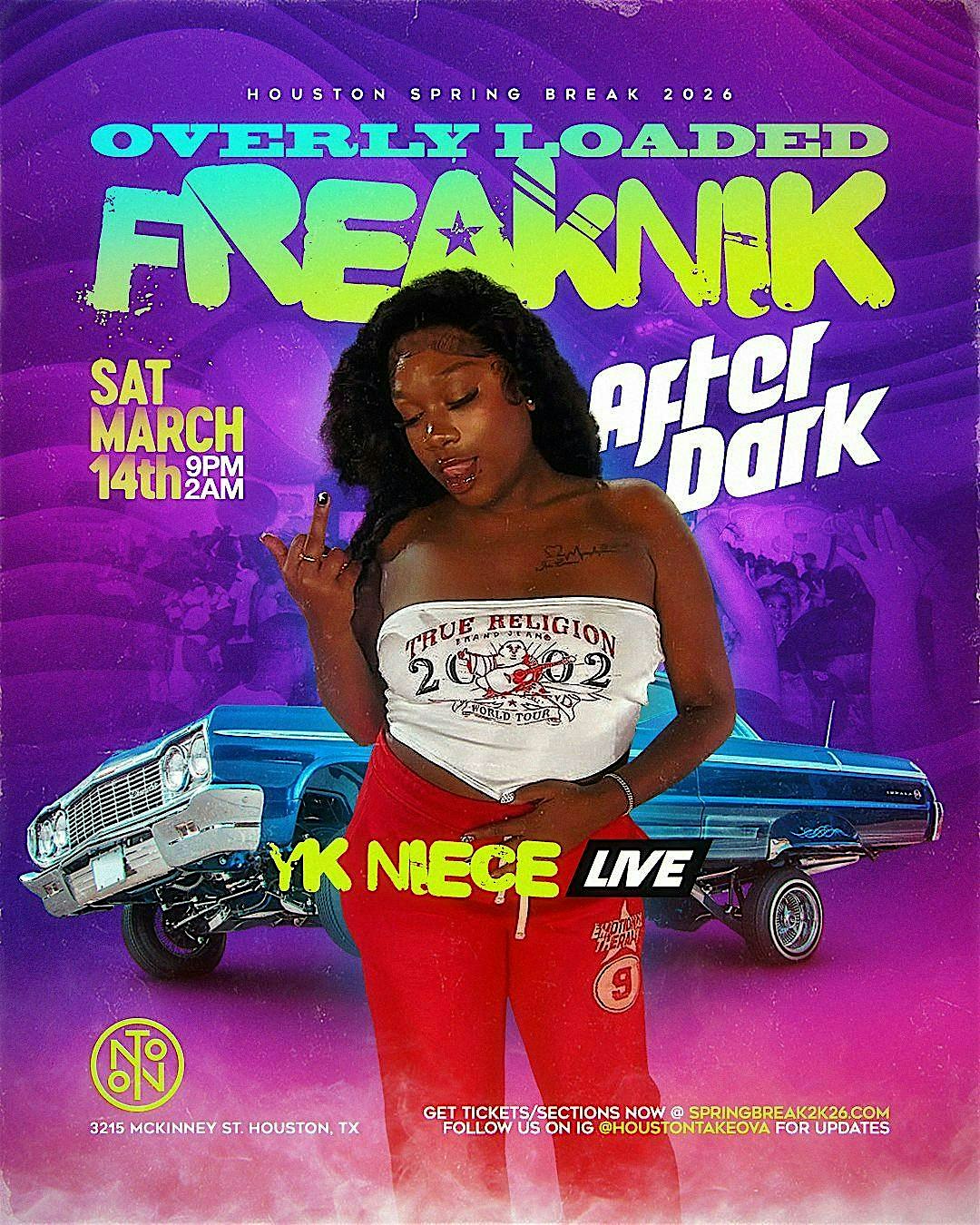 by admin12Feb YK NIECE LIVE @ FREAKNIK – SPRING BREAK HOUSTON at NOTO Houston – Houston, TX YK NIECE LIVE @ FREAKNIK – SPRING BREAK HOUSTON at NOTO Houston – Houston, TX 3 3 people viewed this event. An overly loaded Spring Break takeover with nonstop music, vibes, and high-energy performances. Tickets-RSVP Link Date And Time Sunday, March 15th, 2026 02:00 AM (PST) Venue NOTO Houston Location 3215 McKinney Street, Houston, TX 77003 Event Types MusicParty or Social GatheringSpring Break Event Category HoustonTexas Share With Friends Facebook Twitter Linkedin Xing Pinterest Share This Post: