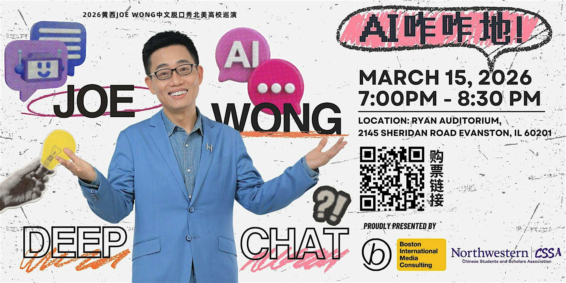 by admin14Feb 2026 西北大学站:黄西Joe Wong中文脱口秀 – AI咋咋地 at Ryan Auditorium – Evanston, IL 2026 西北大学站:黄西Joe Wong中文脱口秀 – AI咋咋地 at Ryan Auditorium – Evanston, IL 2 2 people viewed this event. 2025 西北大学特别专场邀您与黄西(Joe Wong)共度欢乐夜晚!黄西将用幽默讲述华人在美生活的点滴趣事,探讨文化碰撞与生活挑战。让我们在欢声笑语中找到共鸣,体验一场关于AI,生活与文化的精彩对话! Tickets-RSVP Link Date And Time Monday, March 16th, 2026 12:00 AM (PST) Venue Ryan Auditorium Location 2145 Sheridan Road, Evanston, IL 60201 Event Types Concert or PerformancePerforming & Visual Arts Event Category ChicagoIllinois Share With Friends Facebook Twitter Linkedin Xing Pinterest Share This Post: