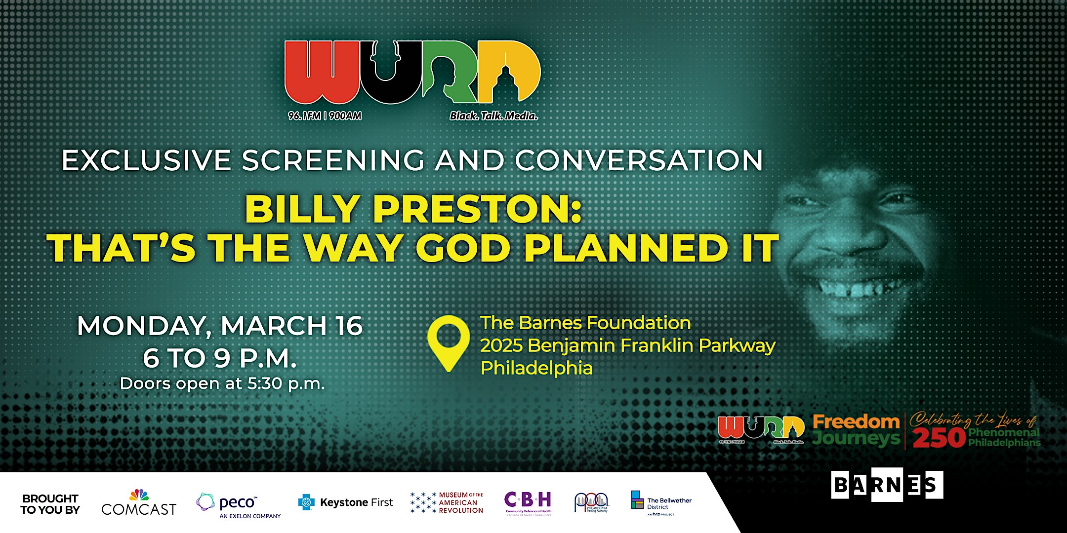 by admin05Mar Billy Preston: That’s the Way God Planned It – A WURD Radio Screening at Barnes Foundation – Philadelphia, PA Billy Preston: That’s the Way God Planned It – A WURD Radio Screening at Barnes Foundation – Philadelphia, PA 2 2 people viewed this event. A Black History Month event and celebration of the legacy of the “Fifth Beatle.” Tickets-RSVP Link Date And Time Monday, March 16th, 2026 05:00 PM (PST) Venue Barnes Foundation Location 2025 Benjamin Franklin Parkway, Philadelphia, PA 19130 Event Types Music Event Category PennsylvaniaPhiladelphia Share With Friends Facebook Twitter Linkedin Xing Pinterest Share This Post: