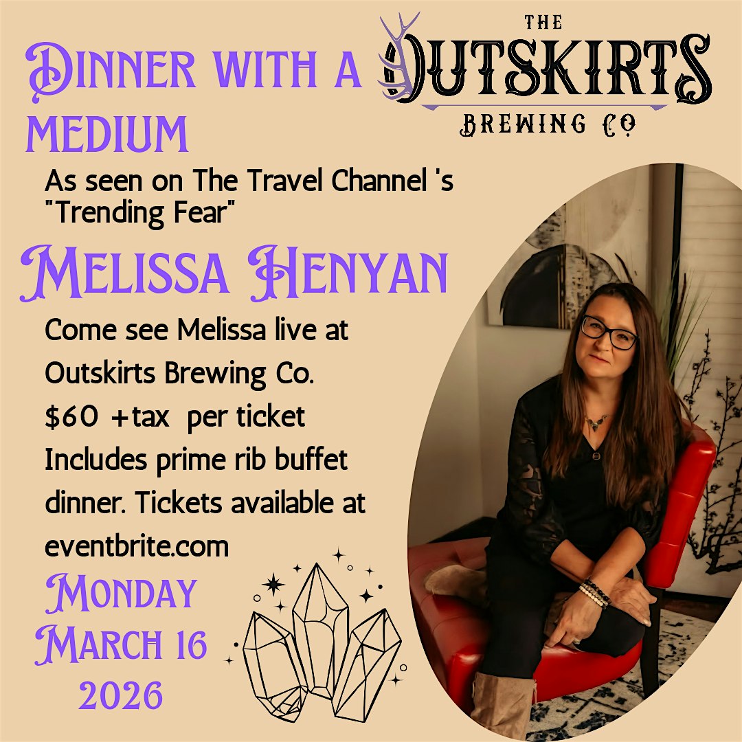 by admin27Feb Dinner with Medium Melissa Henyan at The Outskirts Brewing Co. – Selah, WA Dinner with Medium Melissa Henyan at The Outskirts Brewing Co. – Selah, WA 1 1 people viewed this event. Enjoy an intimate evening of vibes and insights with Medium Melissa Henyan in person! Tickets-RSVP Link Date And Time Monday, March 16th, 2026 06:00 PM (PST) Venue The Outskirts Brewing Co. Location 707 Test Drive Lane, Selah, WA 98942 Event Types Food & Drink Event Category Washington Share With Friends Facebook Twitter Linkedin Xing Pinterest Share This Post: