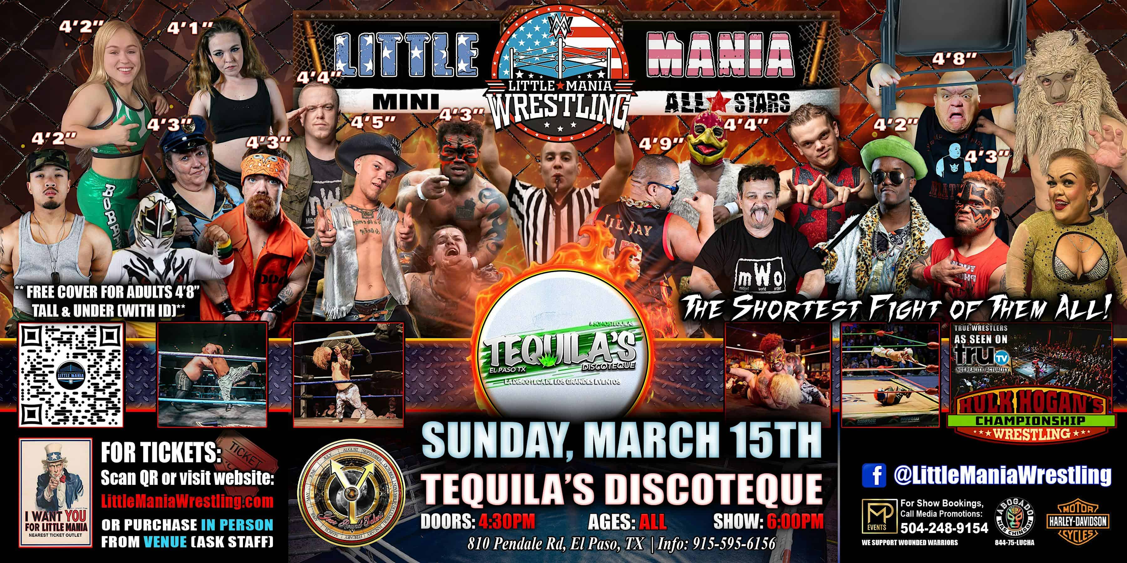 by admin14Feb El Paso, TX – Little Mania Mini Wrestling @ Tequila’s Discoteque at 810 Pendale Rd – El Paso, TX El Paso, TX – Little Mania Mini Wrestling @ Tequila’s Discoteque at 810 Pendale Rd – El Paso, TX 4 4 people viewed this event. “The Shortest Fight of them All!” Little People Flying Fists Match Trash Can Slams Cheese Graters Slap Ladder Dives OH MY GOD tiny hands Tickets-RSVP Link Date And Time Monday, March 16th, 2026 12:00 AM (PST) Venue 810 Pendale Rd Location 810 Pendale Road, El Paso, TX 79907 Event Types Concert or PerformancePerforming & Visual Arts Event Category El PasoTexas Share With Friends Facebook Twitter Linkedin Xing Pinterest Share This Post:
