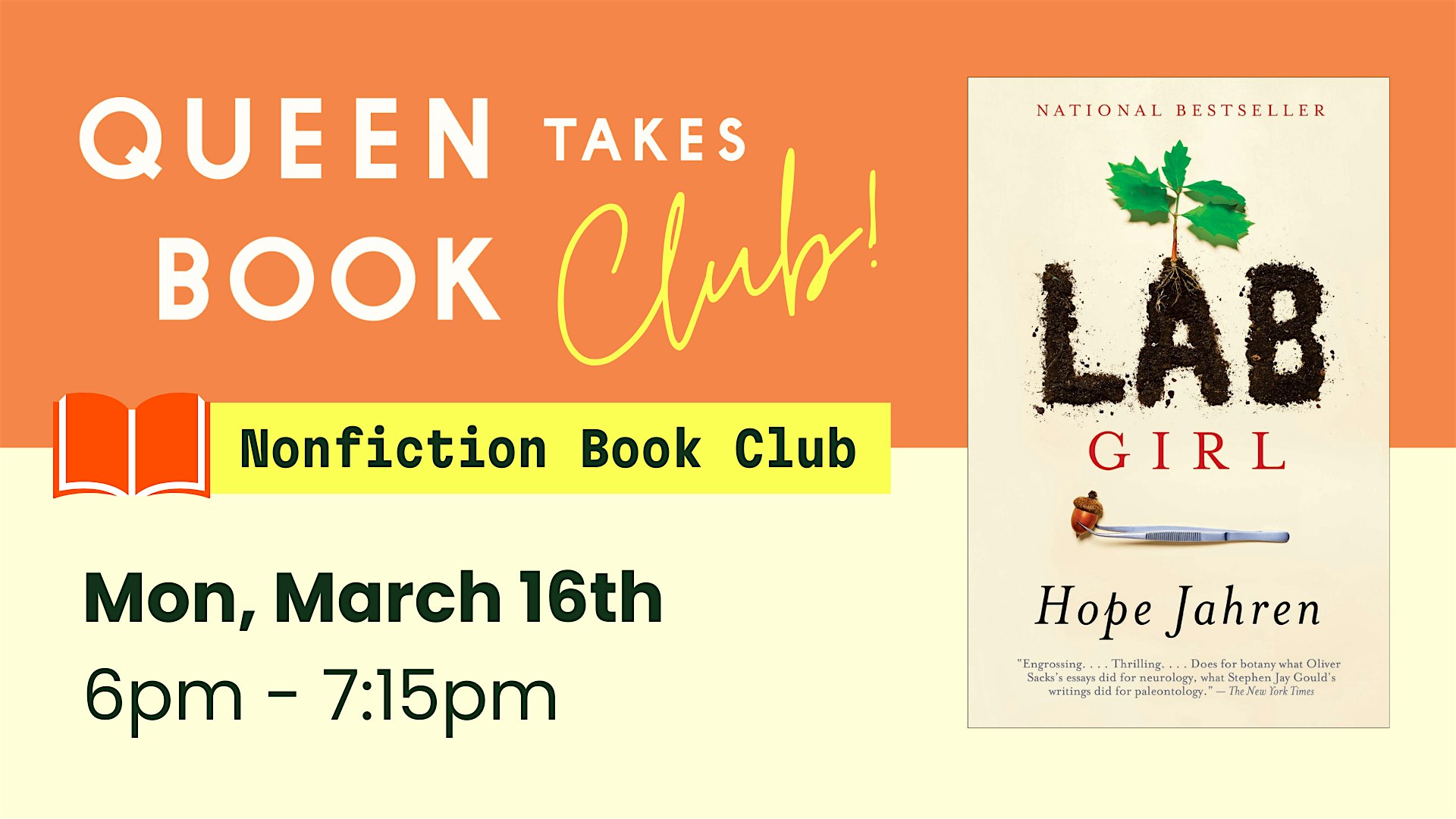by admin13Feb Evening Non-Fiction Club – March ’26 at Queen Takes Book – Columbia, MD Evening Non-Fiction Club – March ’26 at Queen Takes Book – Columbia, MD 2 2 people viewed this event. Join us for our Evening Non-Fiction Club on Monday, March 16th at 6:00pm. This month we’re reading “Lab Girl” by Hope Jahren. Tickets-RSVP Link Date And Time Monday, March 16th, 2026 10:00 PM (PST) Venue Queen Takes Book Location 6955 Oakland Mills Road, Columbia, MD 21045 Event Types Party or Social Gathering Event Category BaltimoreMaryland Share With Friends Facebook Twitter Linkedin Xing Pinterest Share This Post: