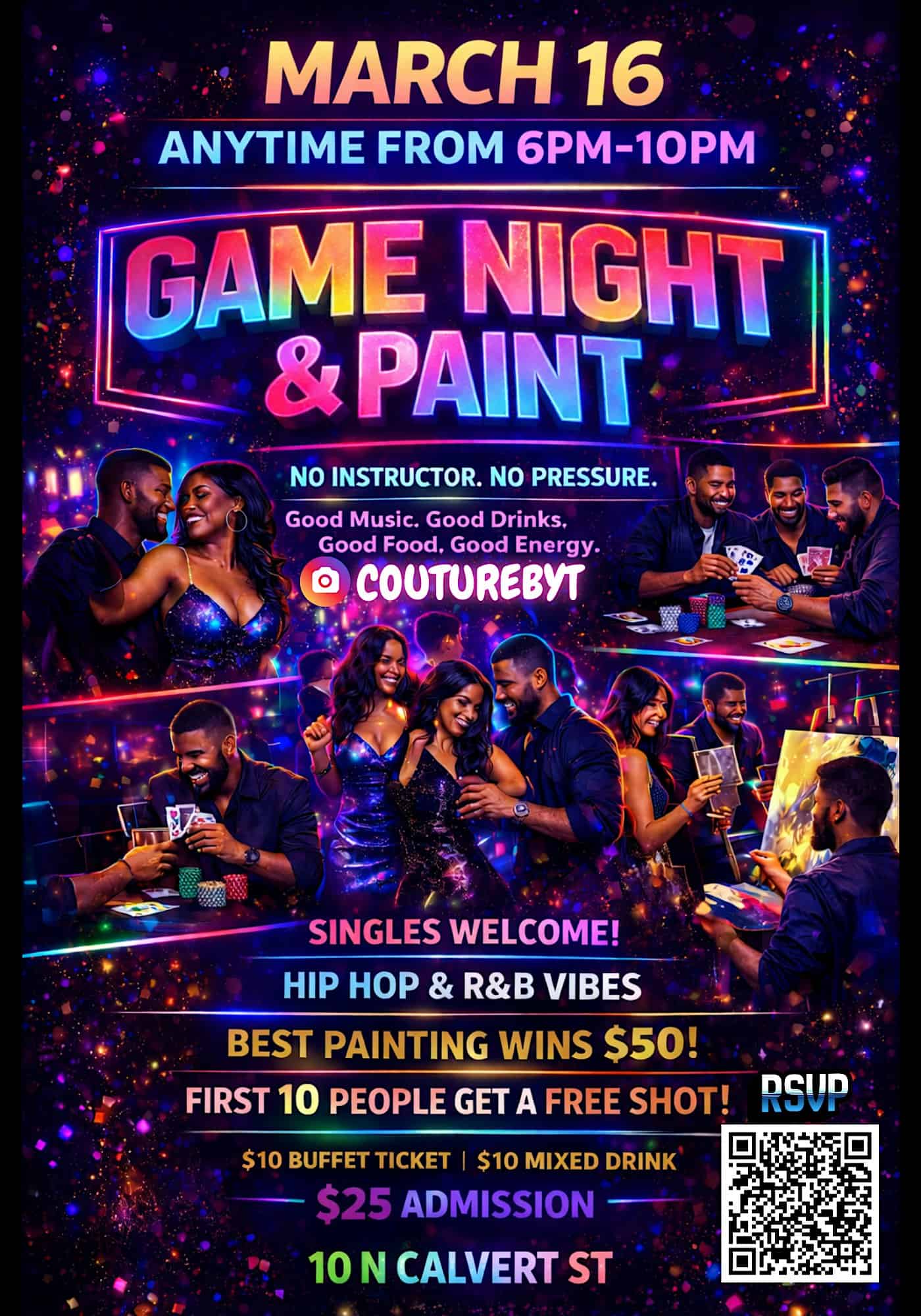 by admin23Feb Game night and paint at 10 N Calvert St – Baltimore, MD Game night and paint at 10 N Calvert St – Baltimore, MD 1 1 people viewed this event. Chill out with some games and get creative with paint—perfect way to kick back and have fun with friends. Tickets-RSVP Link Date And Time Monday, March 16th, 2026 06:00 PM (PST) Venue 10 N Calvert St Location 10 North Calvert Street, Baltimore, MD 21202 Event Types Party or Social Gathering Event Category BaltimoreMaryland Share With Friends Facebook Twitter Linkedin Xing Pinterest Share This Post: