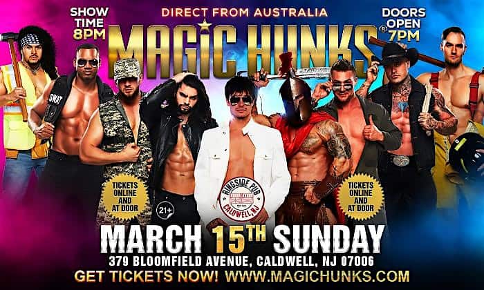 by admin14Feb MAGIC HUNKS® AUSTRALIA TAKEOVER CALDWELL, NJ USA!!! at Ringside – Caldwell, NJ MAGIC HUNKS® AUSTRALIA TAKEOVER CALDWELL, NJ USA!!! at Ringside – Caldwell, NJ 2 2 people viewed this event. Australia’s #1 Ladies Night Event Is Coming to Caldwell! Tickets On Sale NOW! Ages 21+ Doors open at 7pm Don’t miss the Best Night Ever! Tickets-RSVP Link Date And Time Monday, March 16th, 2026 12:00 AM (PST) Venue Ringside Location 379 Bloomfield Avenue, Caldwell, NJ 7006 Event Types Concert or PerformancePerforming & Visual Arts Event Category New Jersey Share With Friends Facebook Twitter Linkedin Xing Pinterest Share This Post: