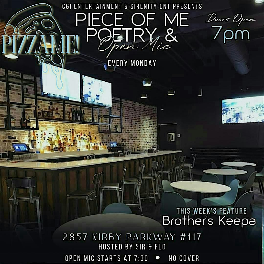 Piece of Me: Poetry & Open Mic Night at PizzaMe! – Memphis, TN Piece of Me: Poetry & Open Mic Night at PizzaMe! – Memphis, TN 1 1 people viewed this event. Open Mic Vibez! Poetry, Comedy, R&B w/ a new feature artist EVERY MONDAY Tickets-RSVP Link Register for event Date And Time Monday, March 16th, 2026 @ 07:00 PM Location 2857 Kirby Road, Memphis, TN 38119 Event Types Concert or PerformancePerforming & Visual Arts Event Category MemphisTennessee Share With Friends Facebook Twitter Linkedin Xing Pinterest