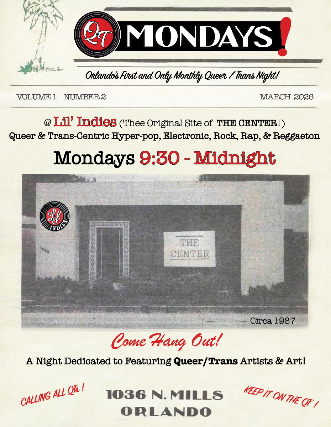 QT Mondays – A Night Dedicated to Featuring Queer/Trans Artists Indies in Orlando Hosted by: Gip$y WithQueer & Trans-Centric Hyper-pop, Electronic, Rock, Rap, & ReggaetonEvery Monday from 9:30 – Midnight21 and up