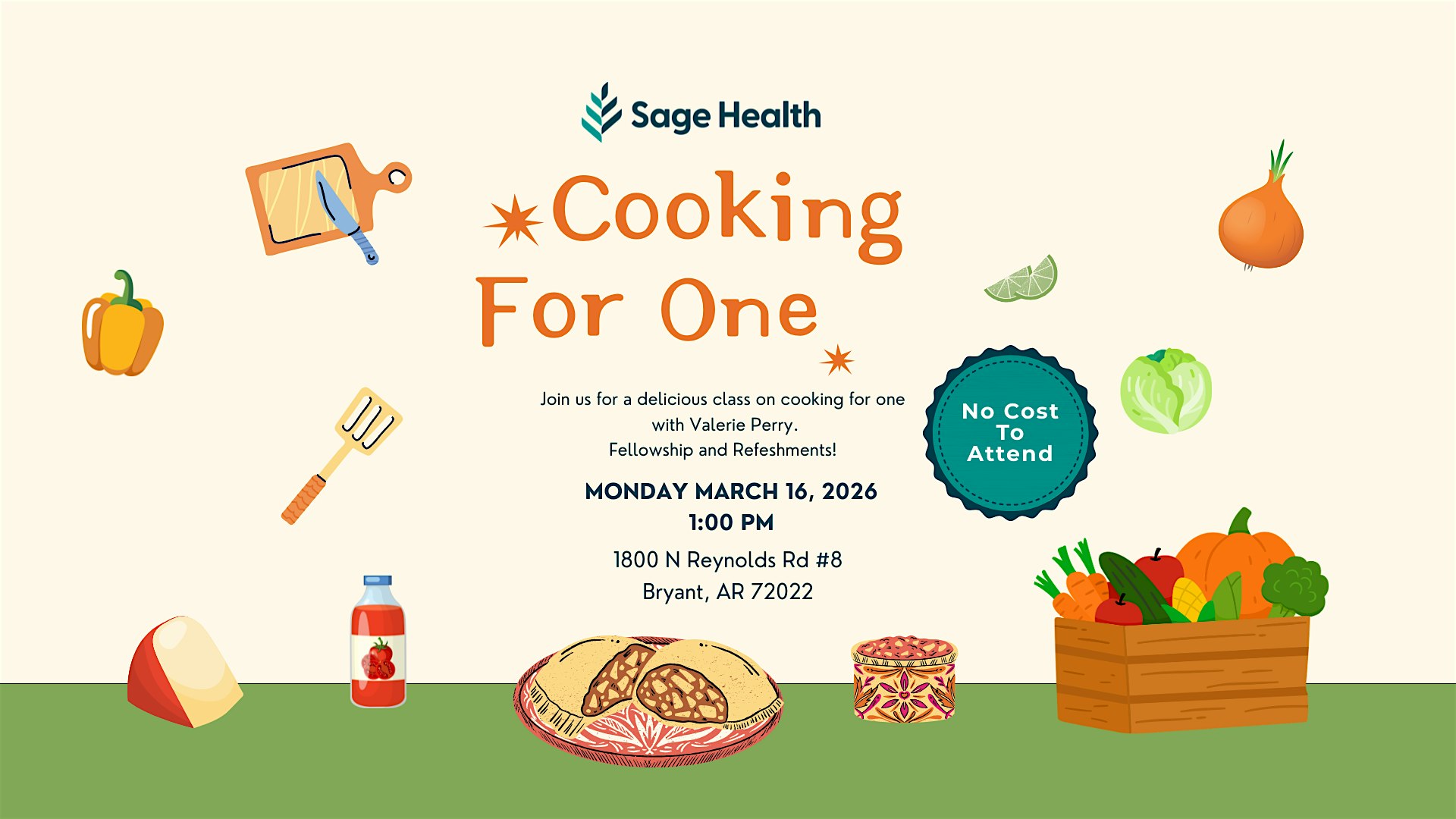 by admin05Mar Sage Health Cooking for One Event at Sage Health Bryant, AR Primary Care Centers – Bryant, AR Sage Health Cooking for One Event at Sage Health Bryant, AR Primary Care Centers – Bryant, AR 4 4 people viewed this event. Join us for a great cooking demo! Tickets-RSVP Link Date And Time Monday, March 16th, 2026 01:00 PM (PST) Venue Sage Health Bryant, AR Primary Care Centers Location 1800 North Reynolds Road, Bryant, AR 72022 Event Types Food & DrinkOther Event Category Arkansas Share With Friends Facebook Twitter Linkedin Xing Pinterest Share This Post:
