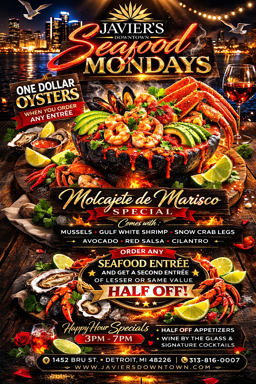 Seafood Mondays At Javiers Downtown at Javier’s Downtown – Detroit, MI Seafood Mondays At Javiers Downtown at Javier’s Downtown – Detroit, MI 2 2 people viewed this event. Come join us every Monday with Seafood Specials all day. Tickets-RSVP Link Register for event Date And Time Monday, March 16th, 2026 @ 03:00 PM Location 1452 Brush Street, Detroit, MI 48226 Event Types Dinner or GalaFood & Drink Event Category DetroitMichigan Share With Friends Facebook Twitter Linkedin Xing Pinterest