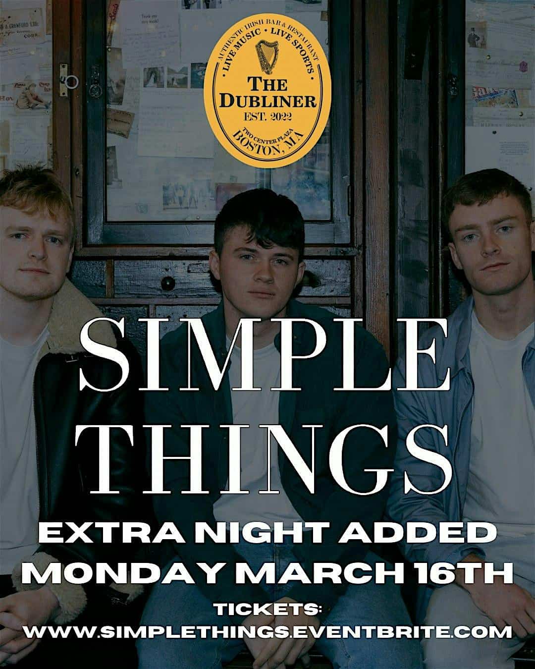 by admin23Feb Simple Things Extra Night at The Dubliner Irish Pub – Boston, MA Simple Things Extra Night at The Dubliner Irish Pub – Boston, MA 1 1 people viewed this event. After selling out night 1, lads will be doing an extra night. Get your tickets quick Tickets-RSVP Link Date And Time Monday, March 16th, 2026 08:00 PM (PST) Venue The Dubliner Irish Pub Location 2 Center Plaza, Boston, MA 2108 Event Types Concert or PerformanceMusic Event Category BostonMassachusetts Share With Friends Facebook Twitter Linkedin Xing Pinterest Share This Post: