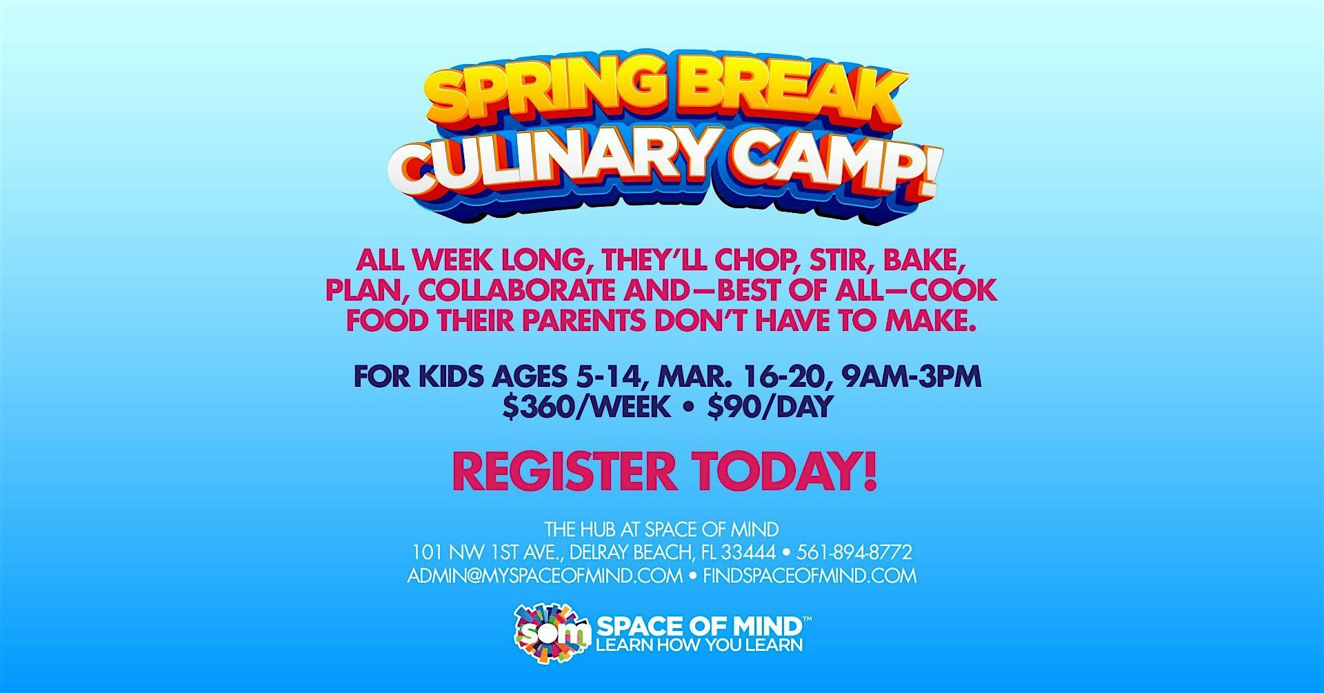 by admin27Feb Spring Break Culinary Camp at The Hub at Space of Mind – Delray Beach, FL Spring Break Culinary Camp at The Hub at Space of Mind – Delray Beach, FL 1 1 people viewed this event. All week long, kids transform into capable, creative, apron-wearing chefs while learning real-life skills they’ll actually use. Tickets-RSVP Link Date And Time Monday, March 16th, 2026 09:00 AM (PST) Venue The Hub at Space of Mind Location 101 NW 1st Ave, Delray Beach, FL 33444 Event Types Food & Drink Event Category Florida Share With Friends Facebook Twitter Linkedin Xing Pinterest Share This Post: