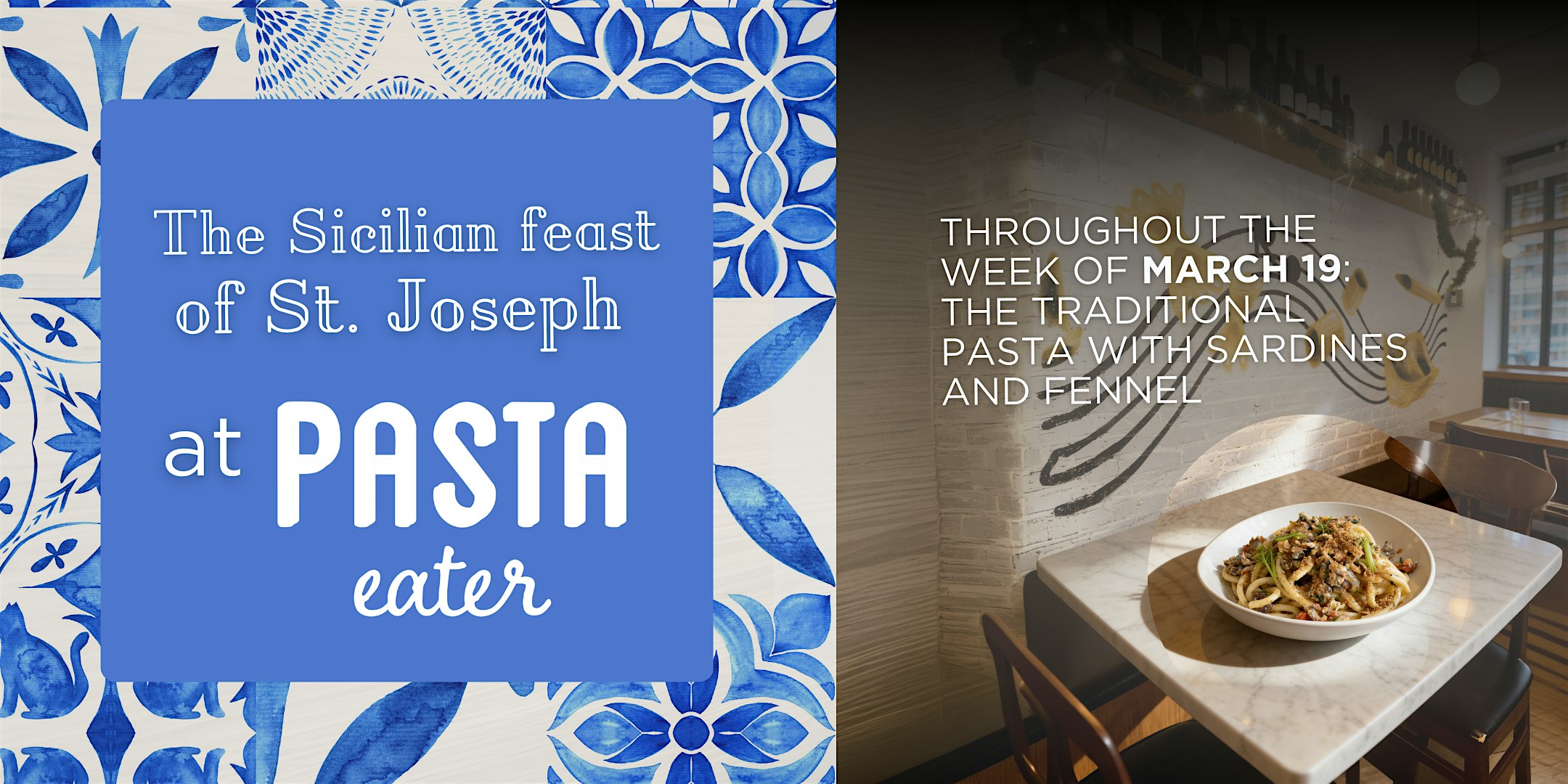 by admin27Feb St. Joseph Feast by Pasta Eater at Pasta Eater – New York, NY St. Joseph Feast by Pasta Eater at Pasta Eater – New York, NY 1 1 people viewed this event. Celebrate St. Joseph’s Day with us! All week long, starting March 19th, enjoy the traditional Sicilian pasta with sardines and wild fennel. Tickets-RSVP Link Date And Time Monday, March 16th, 2026 11:00 AM (PST) Venue Pasta Eater Location 9 East 17th Street, New York, NY 10003 Event Types Festival or FairFood & Drink Event Category New YorkNew York City Share With Friends Facebook Twitter Linkedin Xing Pinterest Share This Post: